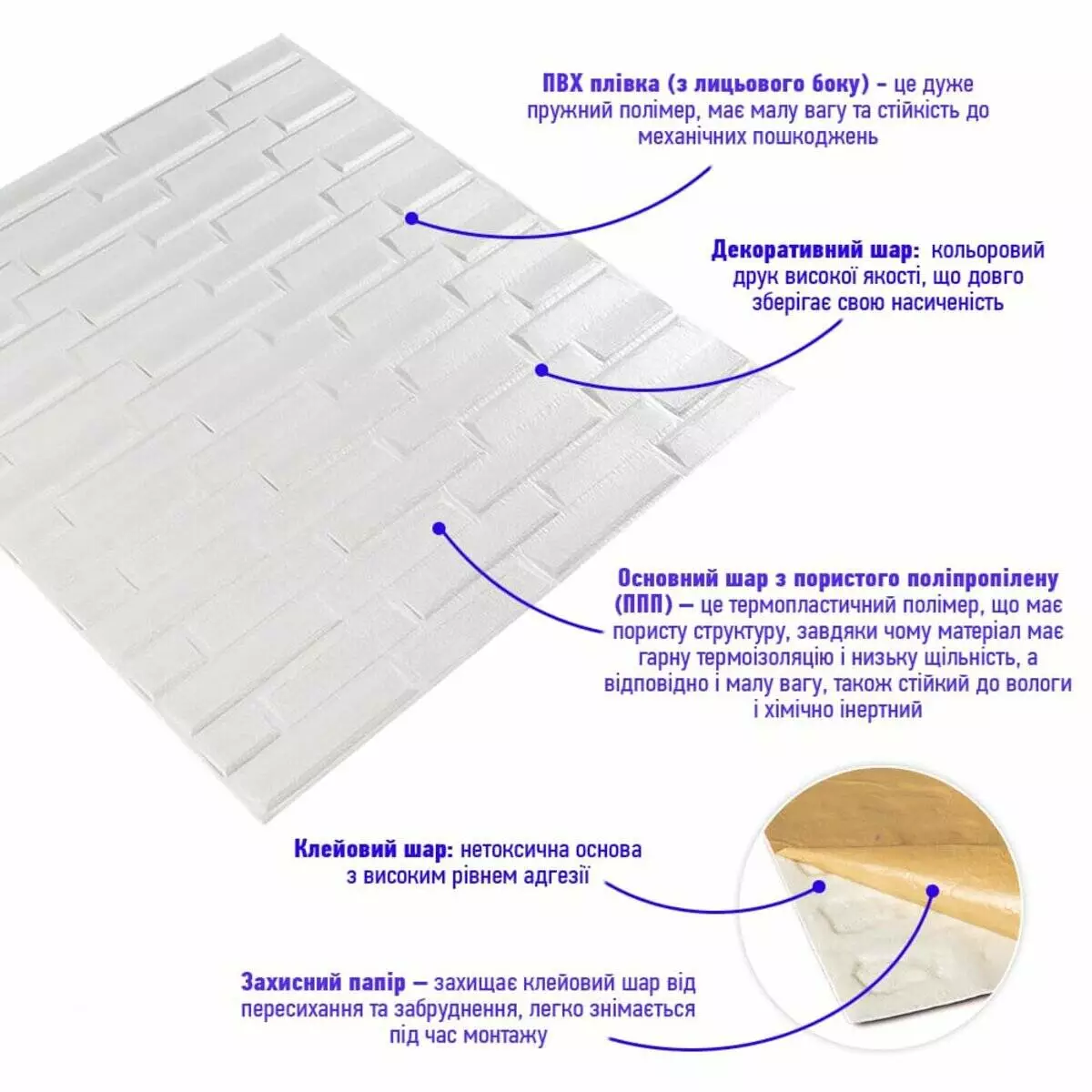 3D панелі самоклеючі – декоративне покриття для стін, виконане з легкого та міцного матеріалу – пористого поліпропілену (ППП). Основна особливість – рельєфний малюнок у вигляді цегли у широкому різноманітті кольорів та наявність клейового шару, що дозволяє встановити панелі без необхідності застосування додаткових матеріалів.