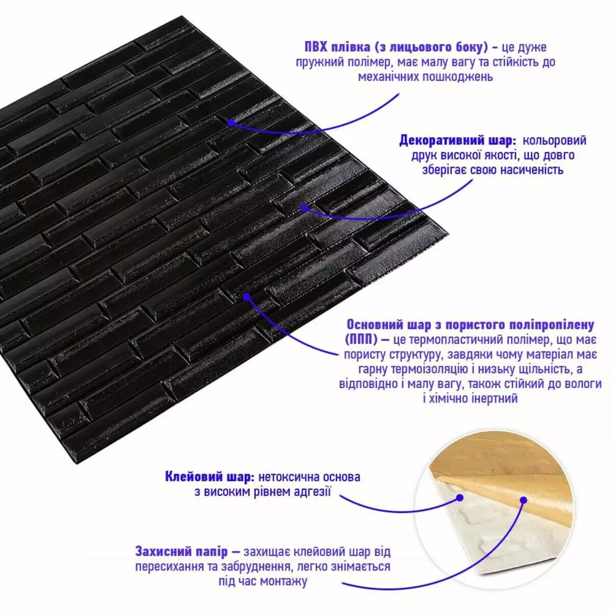 - Легкість монтажу: наявність клейового шару дозволяє встановити панелі без необхідності застосування додаткових матеріалів.