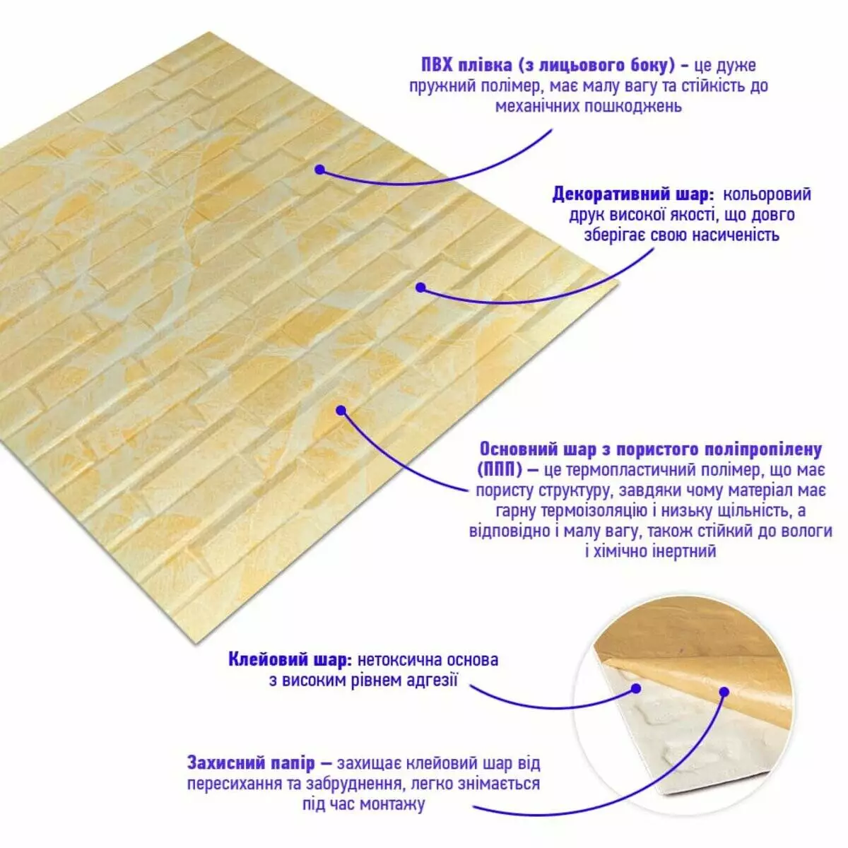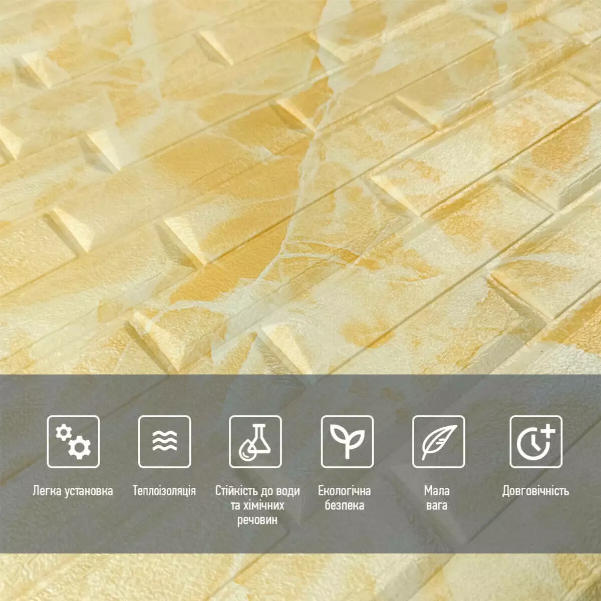 - Легкість монтажу: наявність клейового шару дозволяє встановити панелі без необхідності застосування додаткових матеріалів.