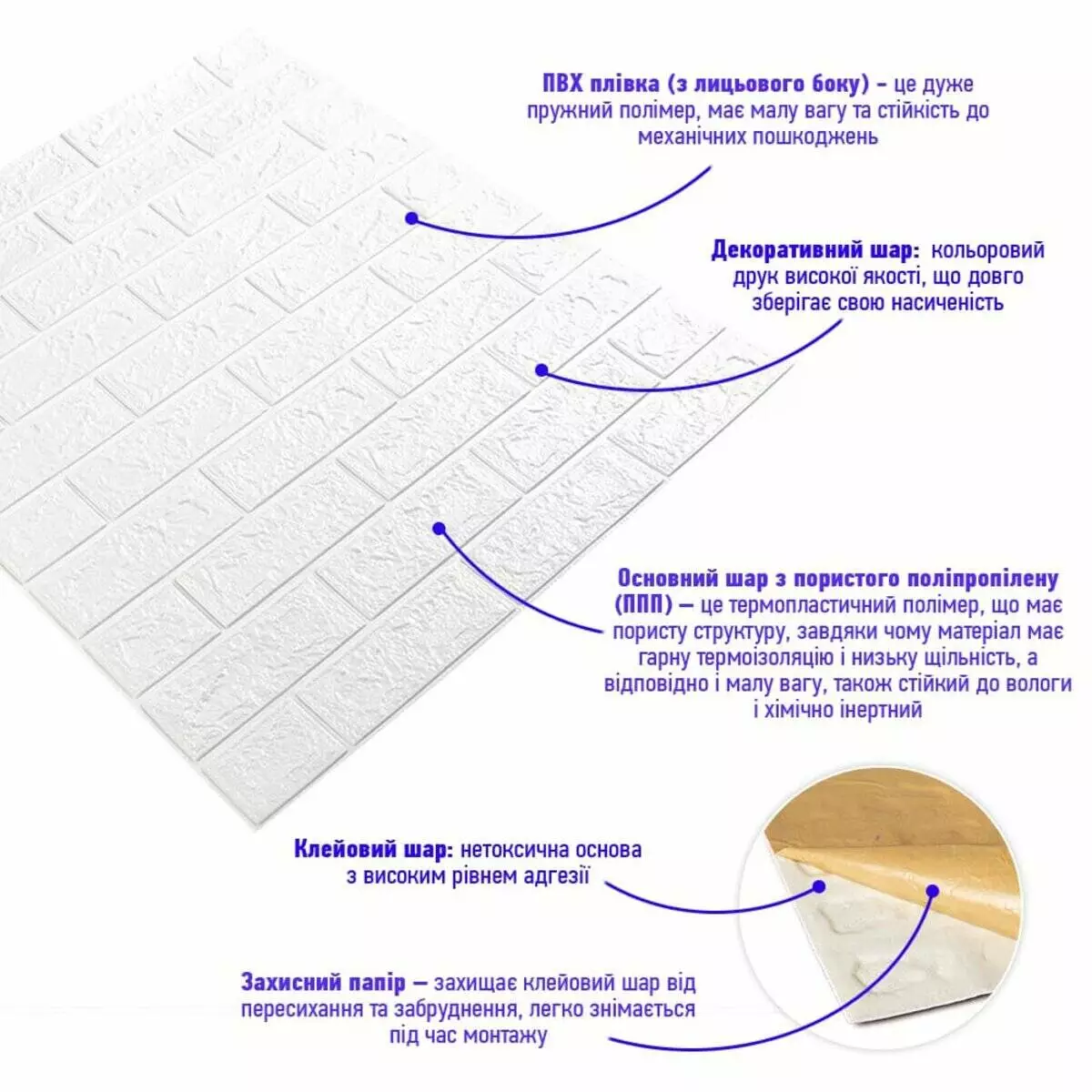 - Захисний папір – оберігає клейовий шар від пересихання та забруднення, легко знімається під час монтажу.