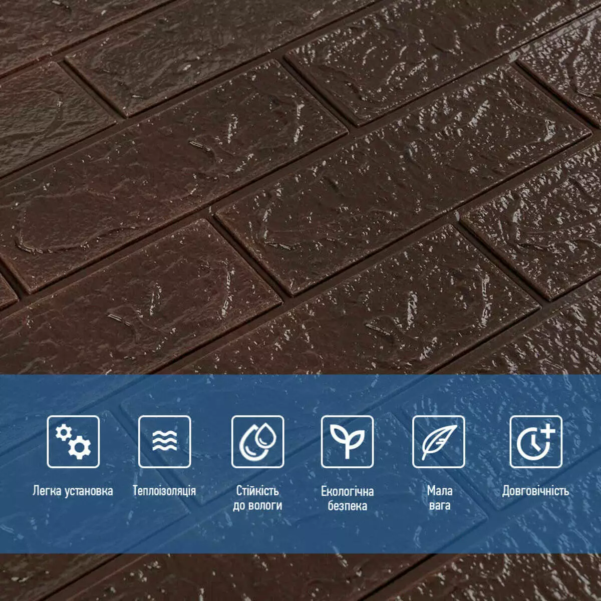 3D панелі самоклеючі – декоративне покриття для стін, виконане з легкого та міцного матеріалу – пористого поліпропілену (ППП). Основна особливість – рельєфний малюнок у вигляді цегли у широкому різноманітті кольорів та наявність клейового шару, що дозволяє встановити панелі без необхідності застосування додаткових матеріалів.