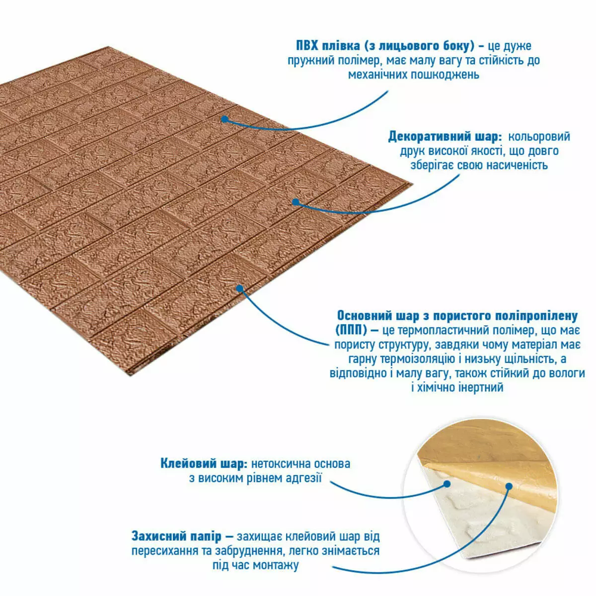 - Захисний папір – оберігає клейовий шар від пересихання та забруднення, легко знімається під час монтажу.