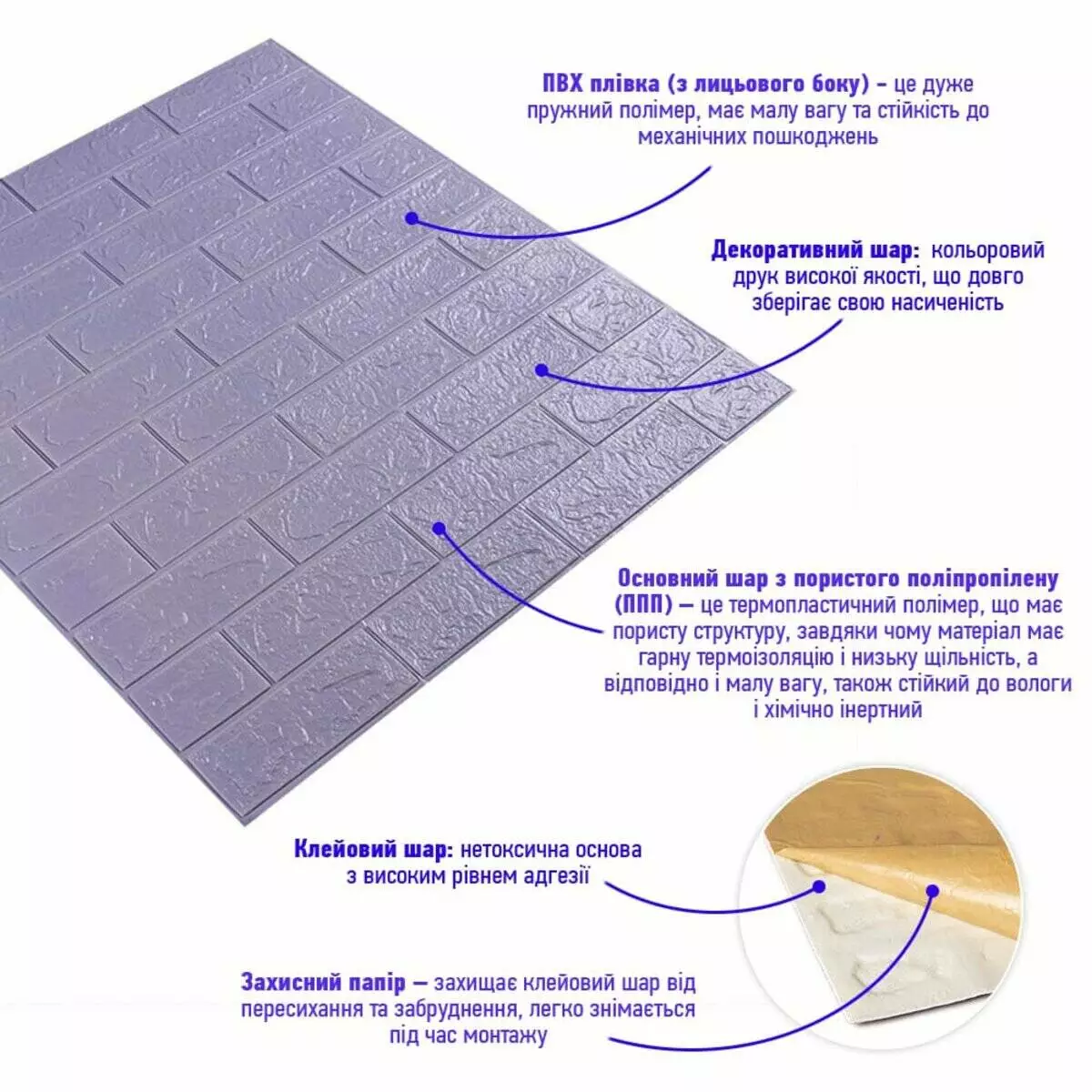 3D панелі самоклеючі – декоративне покриття для стін, виконане з легкого та міцного матеріалу – пористого поліпропілену (ППП). Основна особливість – рельєфний малюнок у вигляді цегли у широкому різноманітті кольорів та наявність клейового шару, що дозволяє встановити панелі без необхідності застосування додаткових матеріалів.
