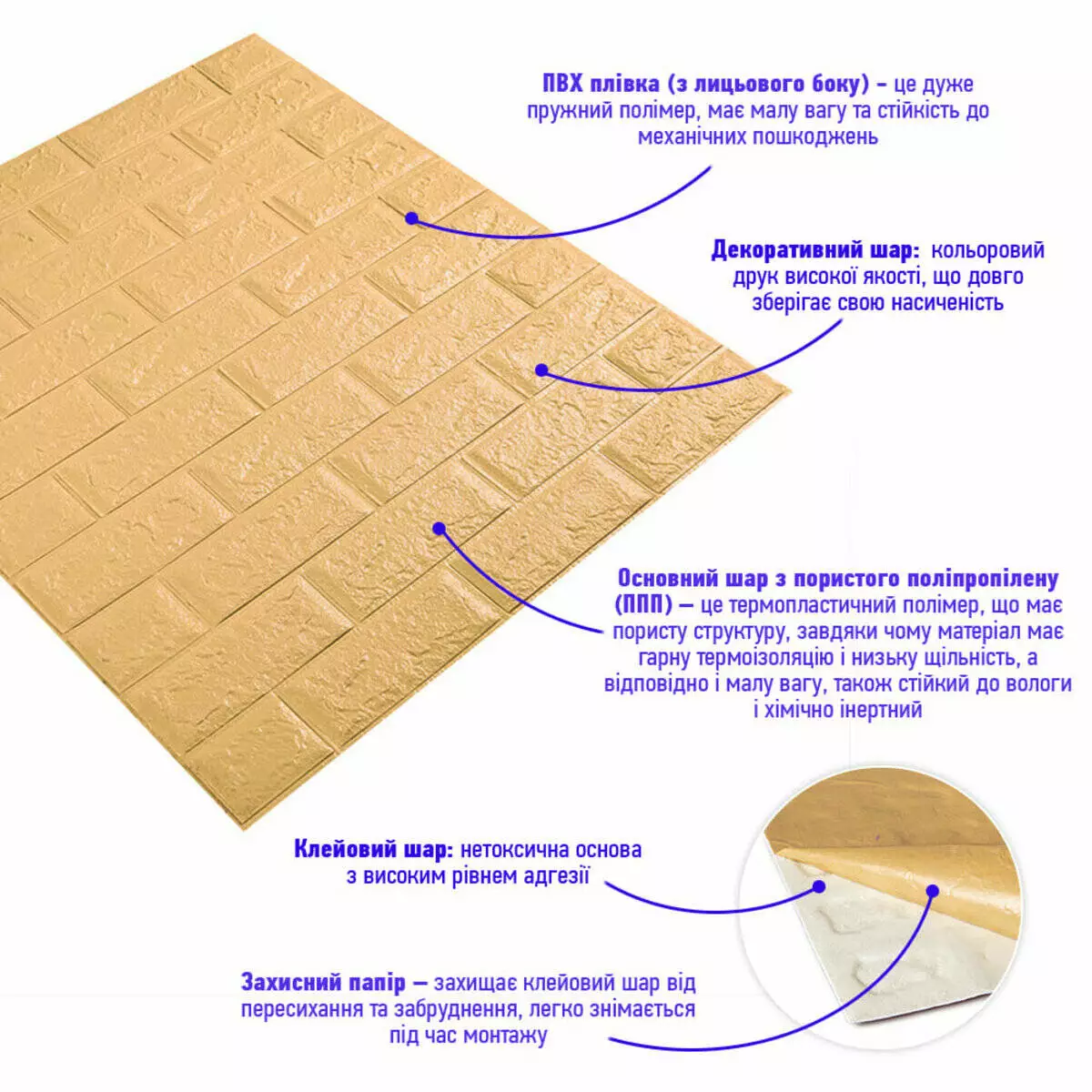 3D панелі самоклеючі – декоративне покриття для стін, виконане з легкого та міцного матеріалу – пористого поліпропілену (ППП). Основна особливість – рельєфний малюнок у вигляді цегли у широкому різноманітті кольорів та наявність клейового шару, що дозволяє встановити панелі без необхідності застосування додаткових матеріалів.