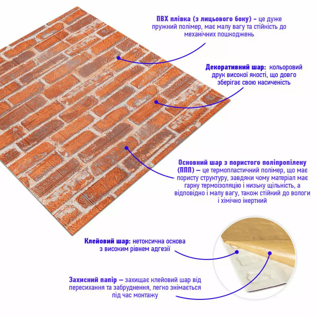 - Захисний папір – оберігає клейовий шар від пересихання та забруднення, легко знімається під час монтажу.