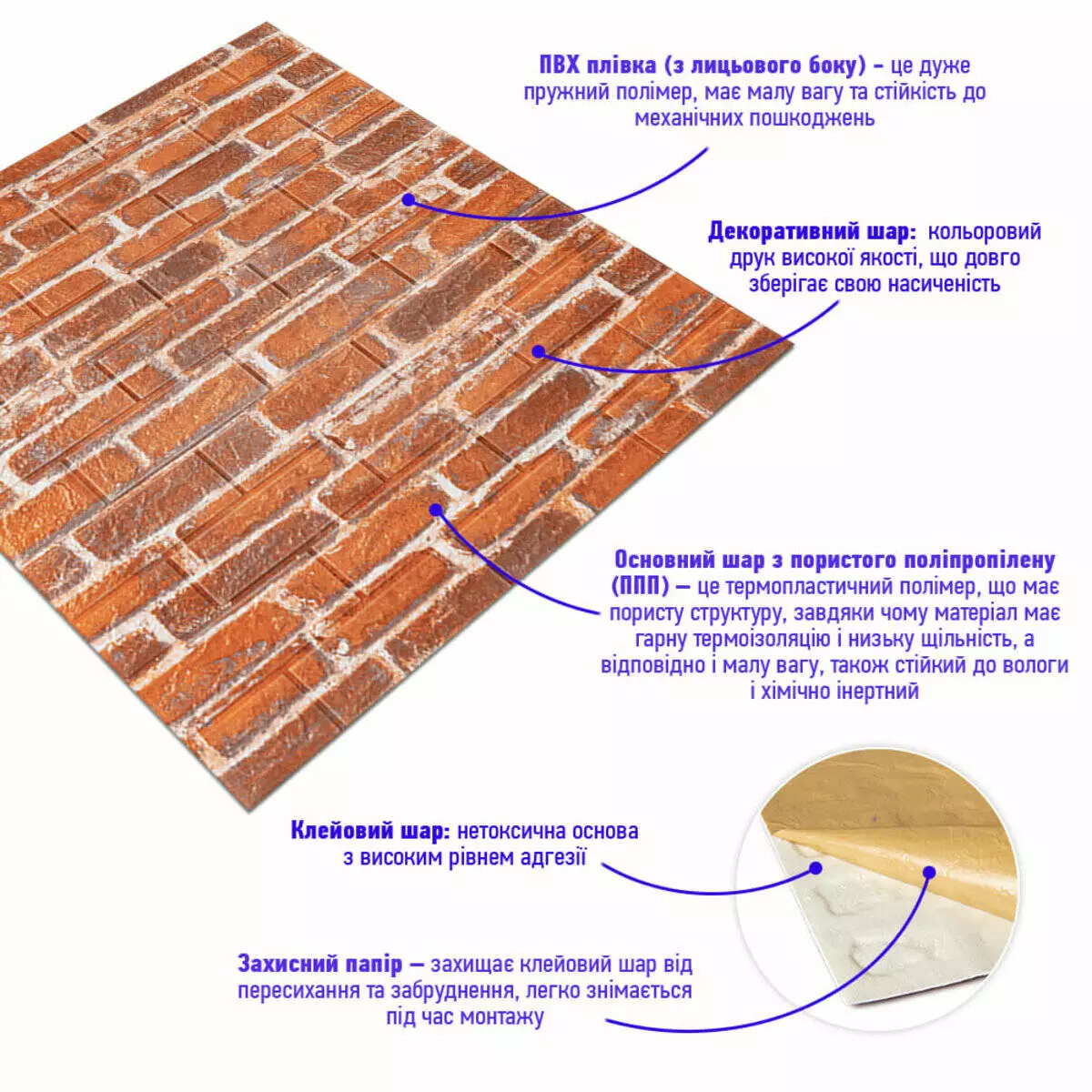 3D панелі самоклеючі – декоративне покриття для стін, виконане з легкого та міцного матеріалу – пористого поліпропілену (ППП). Основна особливість – рельєфний малюнок у вигляді цегли у широкому різноманітті кольорів та наявність клейового шару, що дозволяє встановити панелі без необхідності застосування додаткових матеріалів.