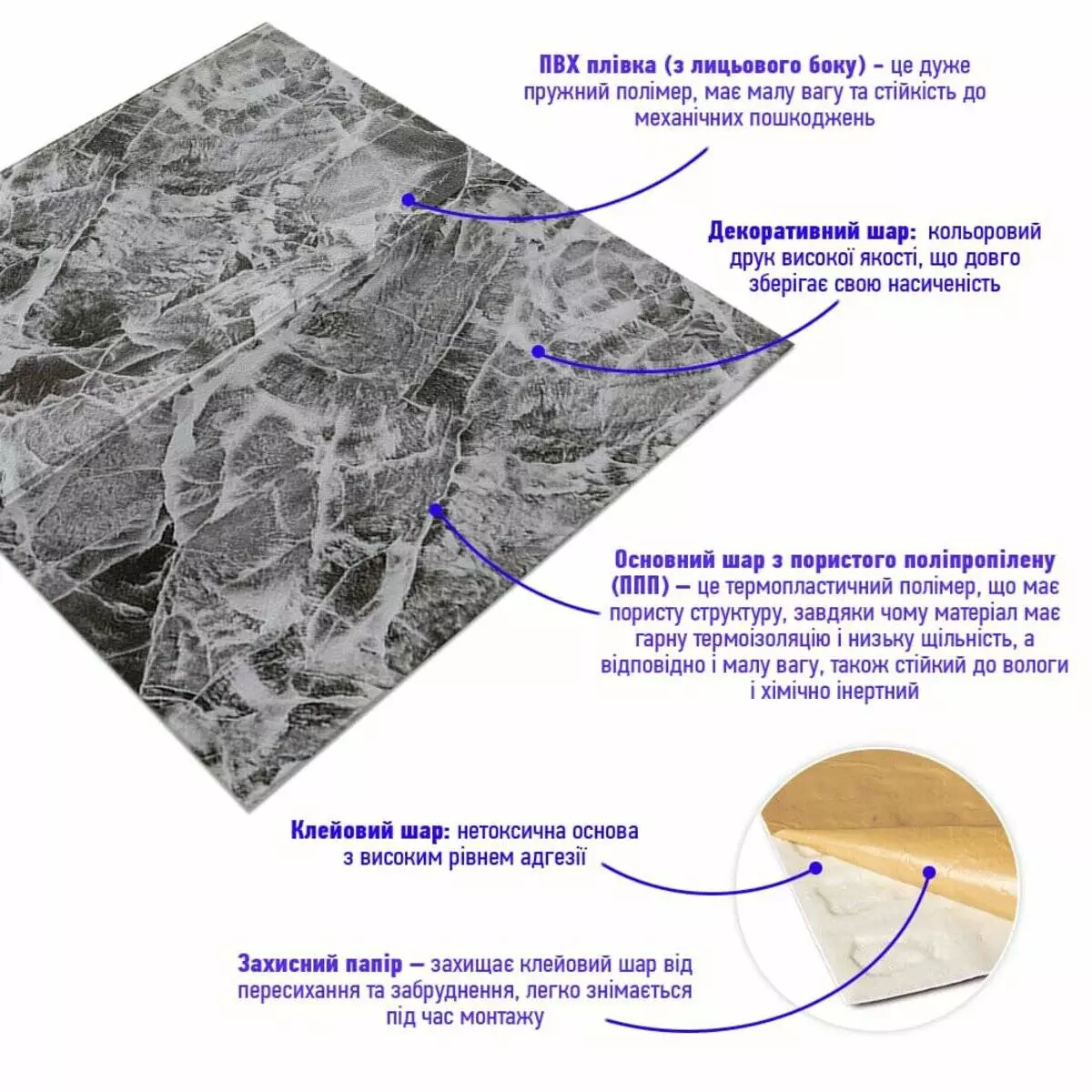Декоративна панель під мармур виготовлена із спіненого поліпропілену. Це універсальний і щільний матеріал, але водночас легкий. Його термін служби понад 20 років. Самоклеючі 3D панелі з поліпропілену - це швидкий ремонт з мінімумом шуму та будівельного сміття.