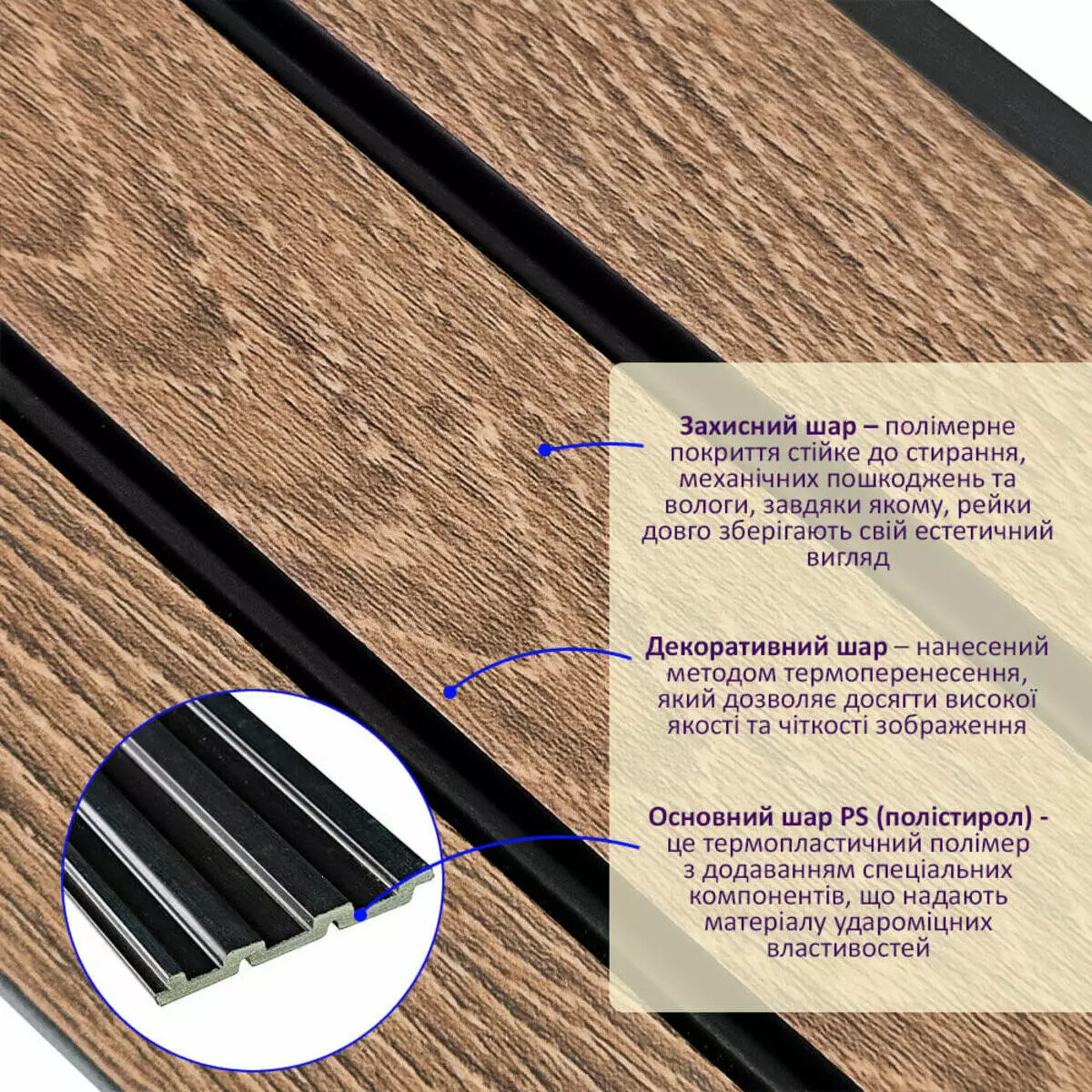 - Захисний шар – полімерне покриття стійке до стирання, механічних пошкоджень та вологи, завдяки якому, рейки довго зберігають свій естетичний вигляд.