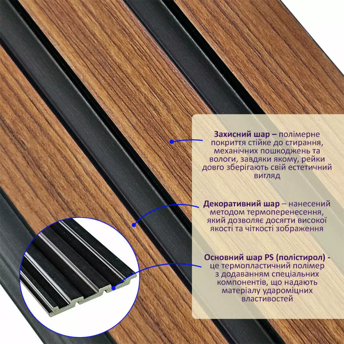 - Захисний шар – полімерне покриття стійке до стирання, механічних пошкоджень та вологи, завдяки якому, рейки довго зберігають свій естетичний вигляд.
