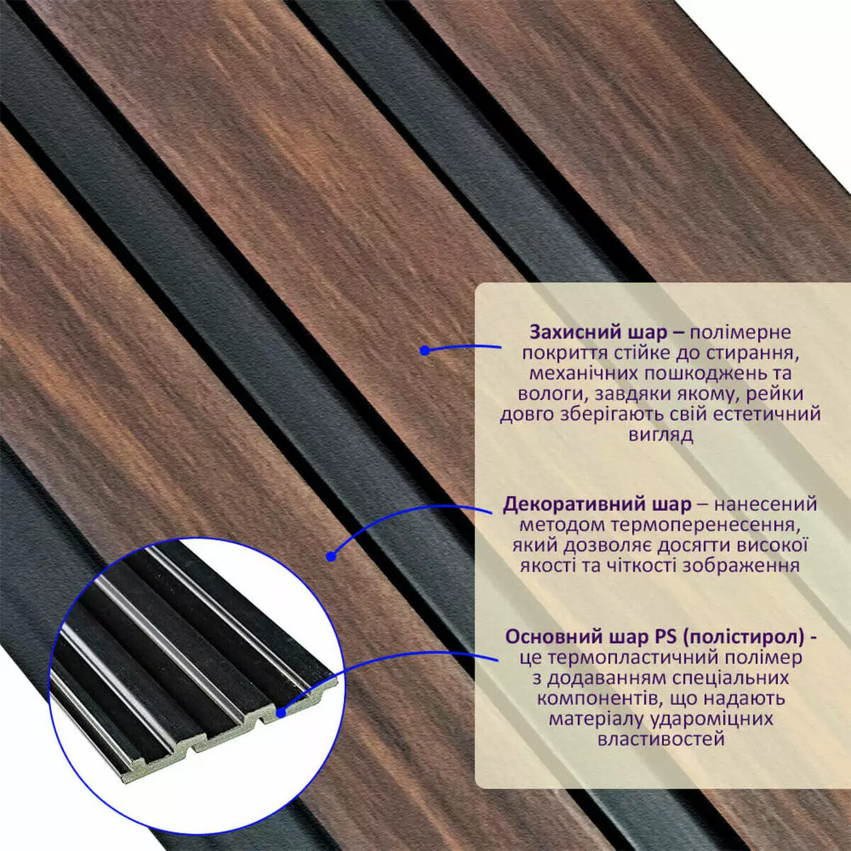 - Захисний шар – полімерне покриття стійке до стирання, механічних пошкоджень та вологи, завдяки якому, рейки довго зберігають свій естетичний вигляд.