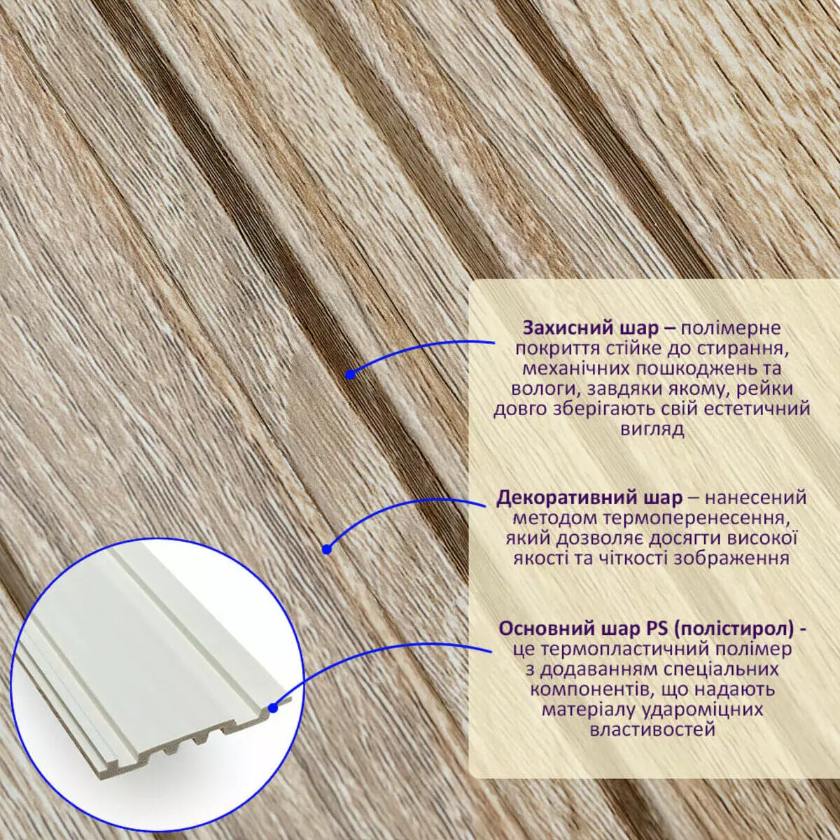 - Захисний шар – полімерне покриття стійке до стирання, механічних пошкоджень та вологи, завдяки якому, рейки довго зберігають свій естетичний вигляд.