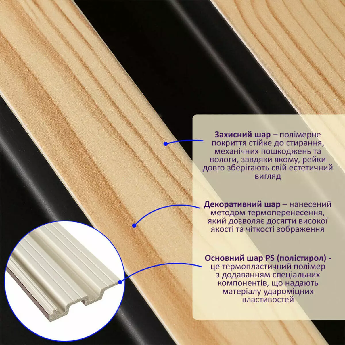 - Захисний шар – полімерне покриття стійке до стирання, механічних пошкоджень та вологи, завдяки якому, рейки довго зберігають свій естетичний вигляд.
