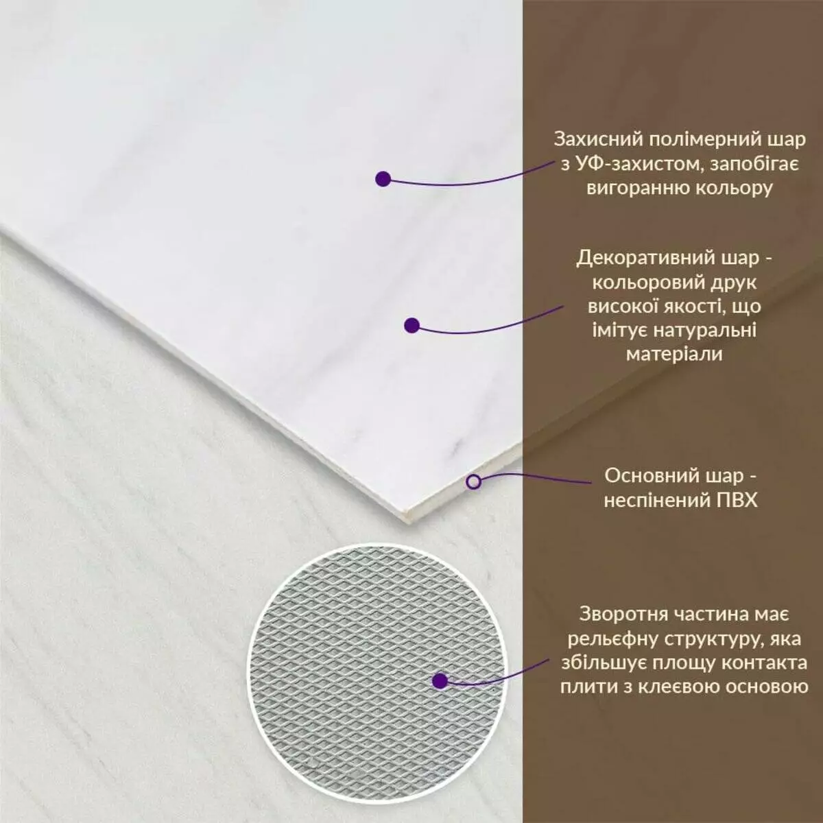 Розмір ПВХ плити - 600ммх600мм. Товщина - 3 мм. Вага листа - 2,4кг