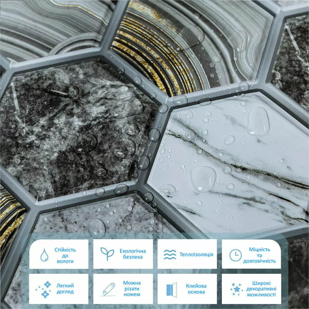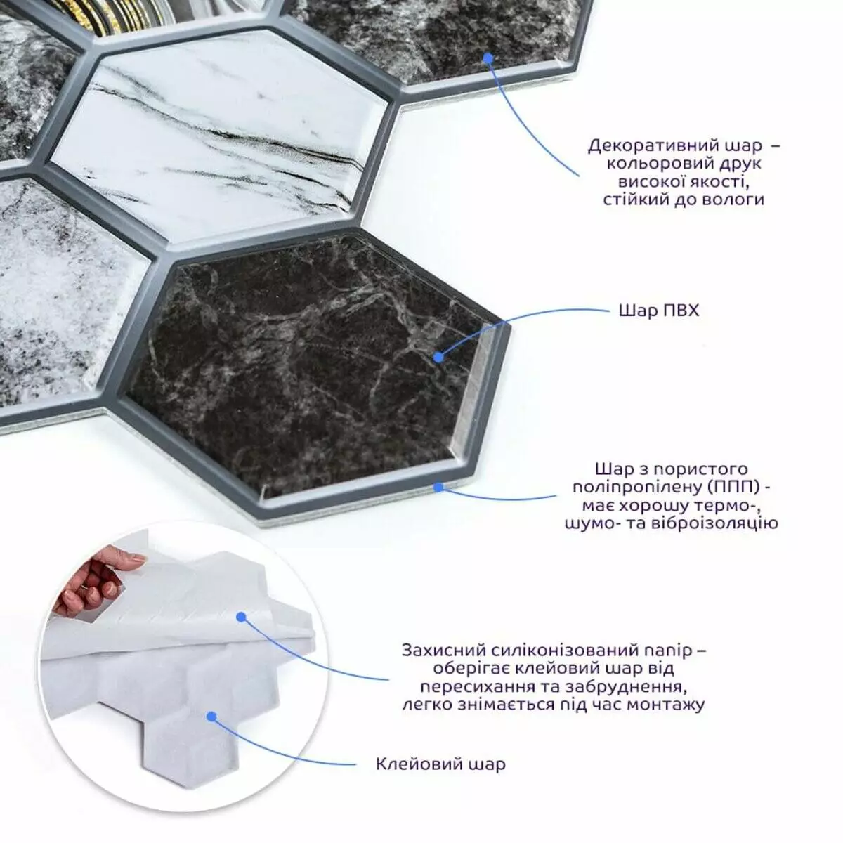 Самоклеючі декоративні панелі СПП - новинка у світі самоклейок. Це невеликі плитки із трендовим малюнком під натуральні матеріали. Прозорий захисний шар із поліуретану захищає покриття від стирання та механічних пошкоджень.