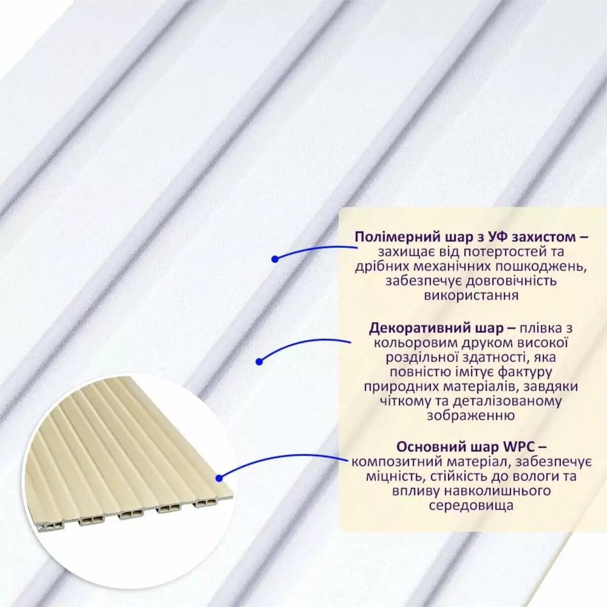 • Основний шар WPC: є композитним матеріалом, який поєднує в собі деревні волокна (або стружку) з полімерними матеріалами, що забезпечує матеріалу міцність, стійкість до вологи і стійкість до впливу зовнішнього середовища.