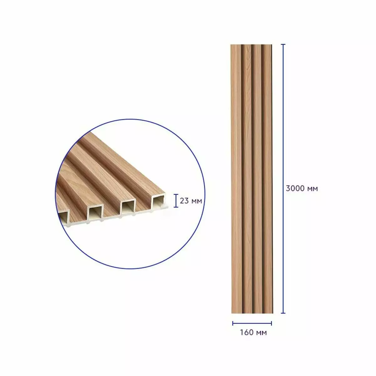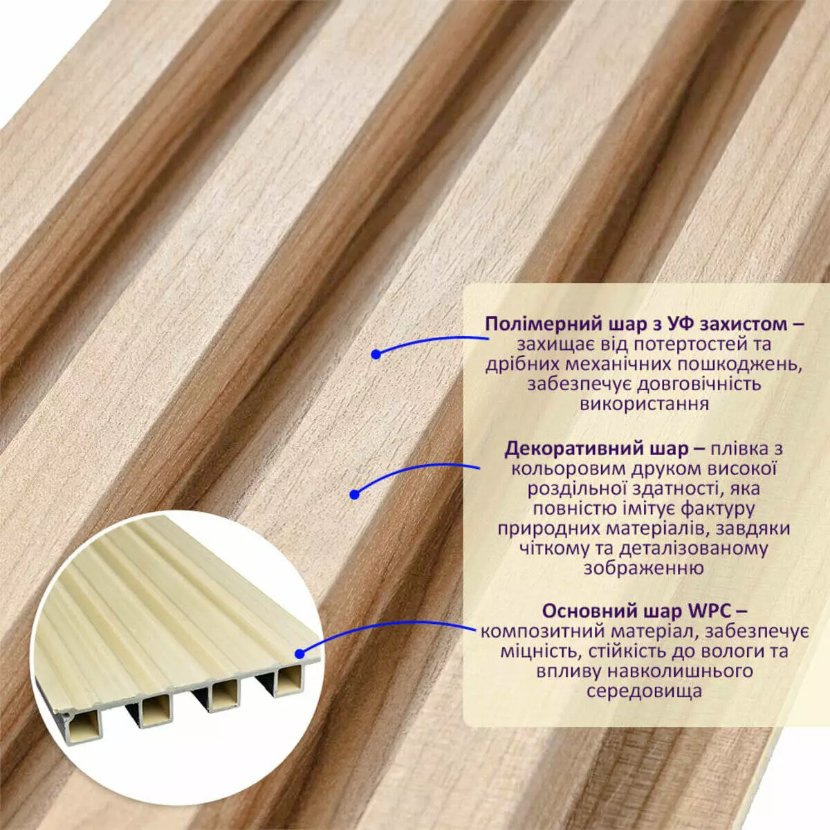 Опис: Стінові рейки WPC – будівельний матеріал для внутрішнього оздоблення, що імітує натуральну деревину.