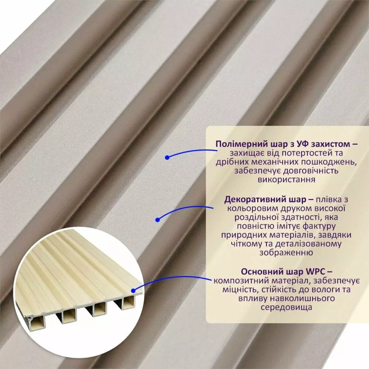 • Основний шар WPC: є композитним матеріалом, який поєднує в собі деревні волокна (або стружку) з полімерними матеріалами, що забезпечує матеріалу міцність, стійкість до вологи і стійкість до впливу зовнішнього середовища.