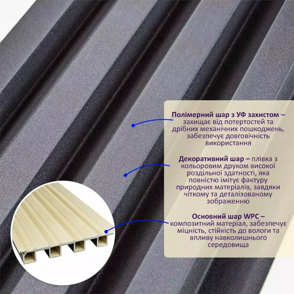 • Стійкість до впливу ультрафіолету: стінові панелі WPC зберігають свій колір та структуру під впливом ультрафіолетового випромінювання.