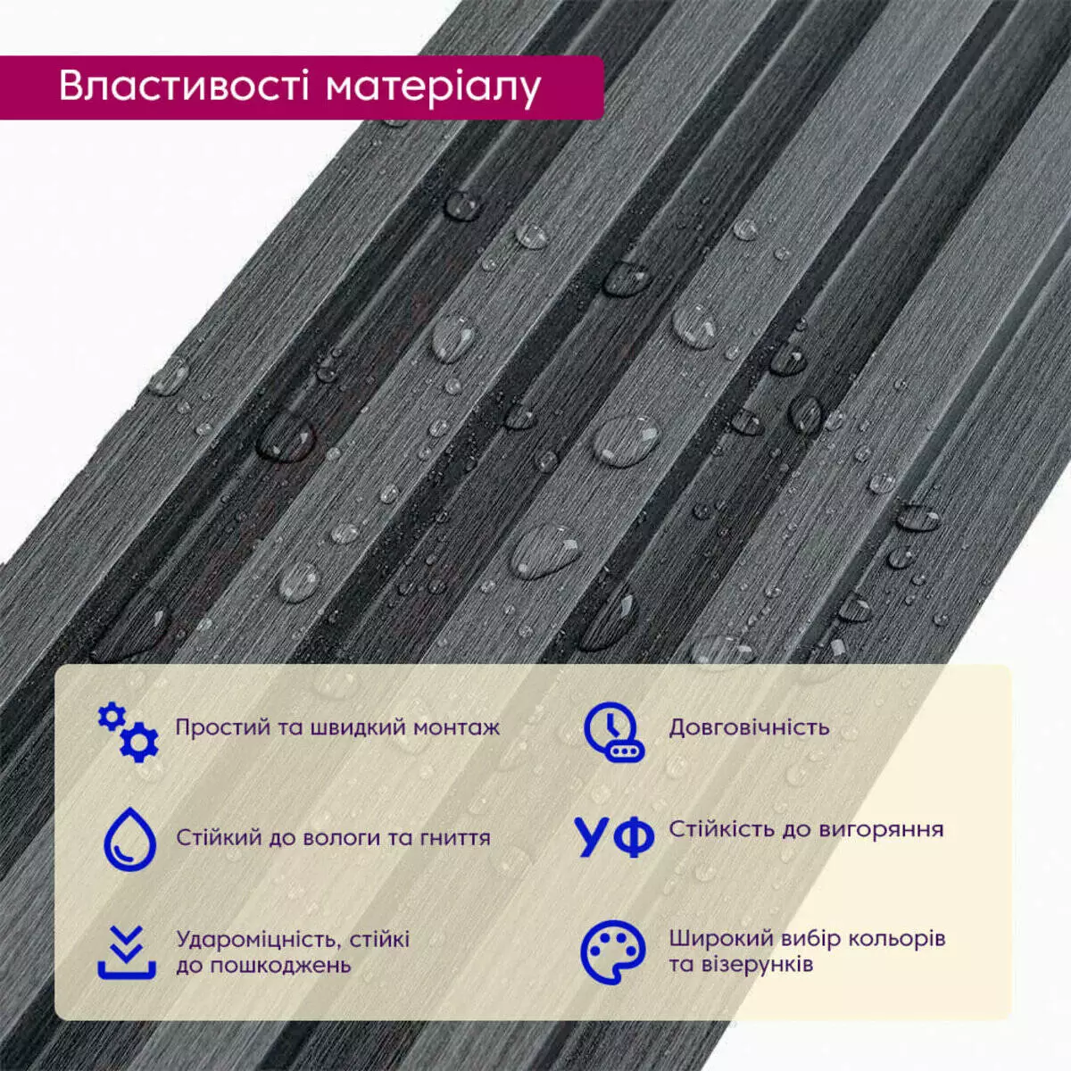 • Стійкість до впливу ультрафіолету: стінові панелі WPC зберігають свій колір та структуру під впливом ультрафіолетового випромінювання.