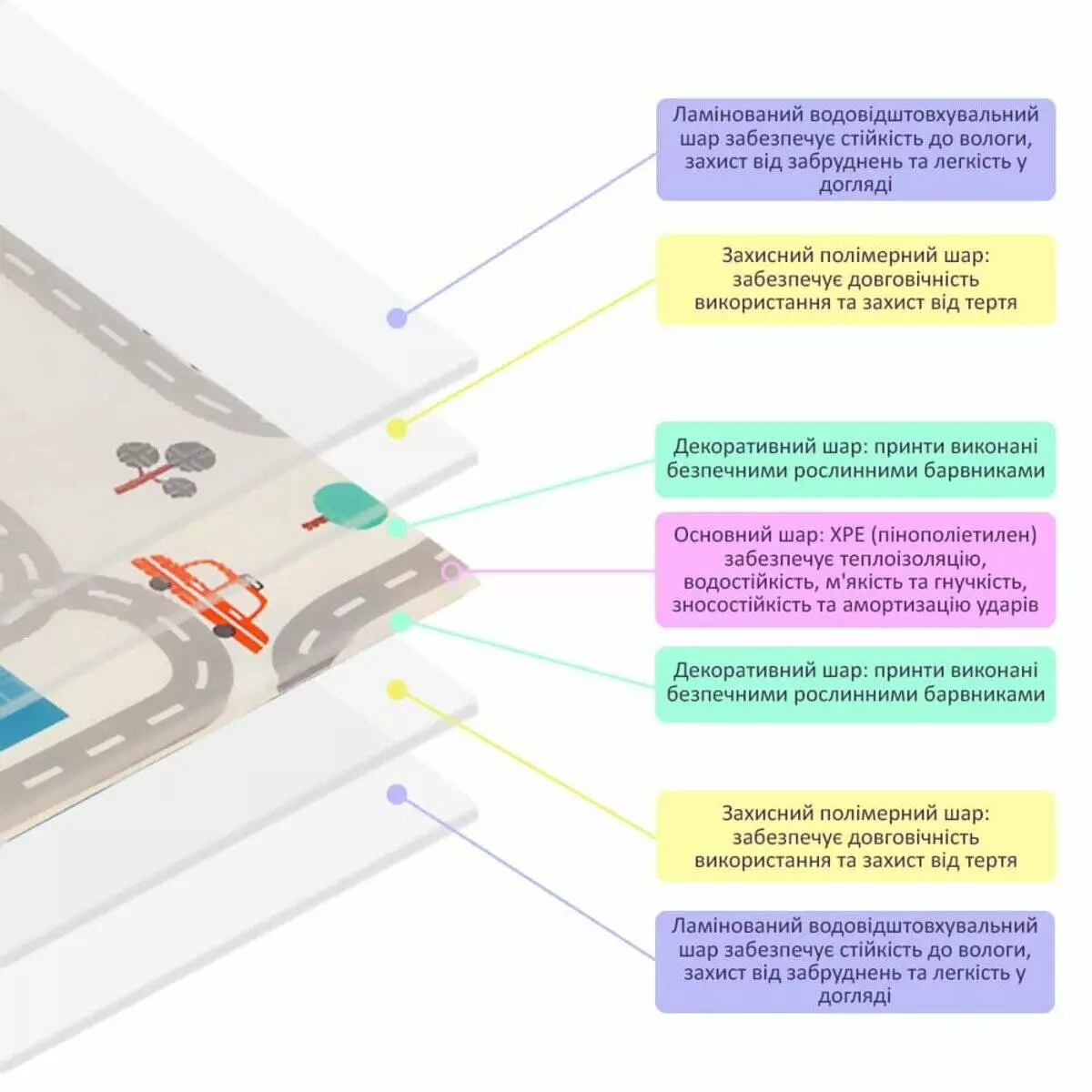 Дитячі розвиваючі термокилимки виготовляються з мультифункціонального, нетоксичного та гіпоалергенного матеріалу XPE (спінений та пресований полімер етилену) та об’єднує в собі багато переваг: теплоізоляція, вологостійкість, зносостійкість, легкість в догляді, м’якість, гнучкість та амортизація падіння малюка, надаючи дітям комфортну та безпечну ігрову поверхню.