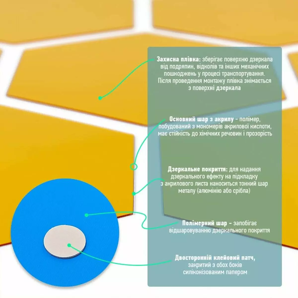 - Дзеркальний шар: це тонке металізоване або полімерне покриття, яке наноситься на акрилову основу та створює ефект дзеркального відбиття. Воно має гладку, світловідбивну поверхню, стійку до вологи та зношування. Завдяки гнучкості матеріалу відображення може незначно викривлюватися.