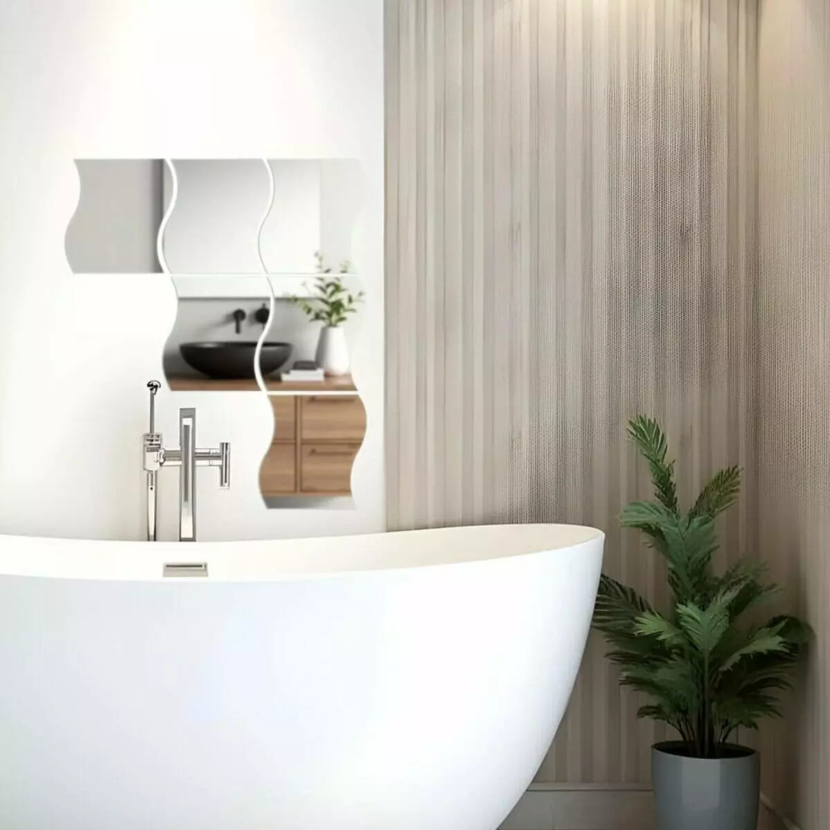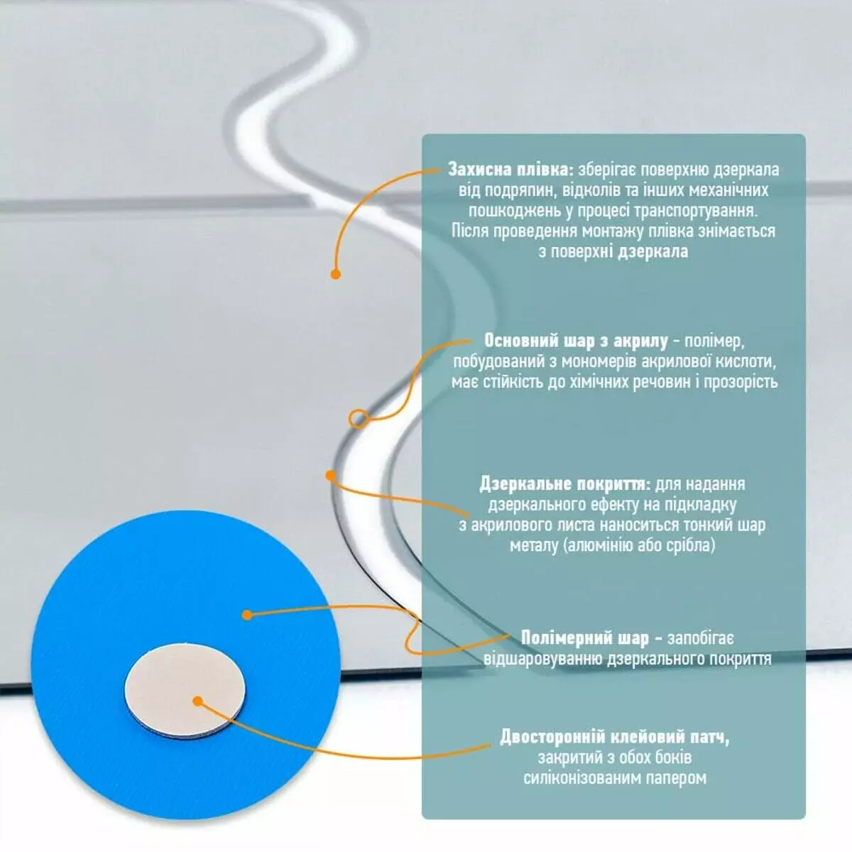 - Дзеркальний шар: це тонке металізоване або полімерне покриття, яке наноситься на акрилову основу та створює ефект дзеркального відбиття. Воно має гладку, світловідбивну поверхню, стійку до вологи та зношування. Завдяки гнучкості матеріалу відображення може незначно викривлюватися.