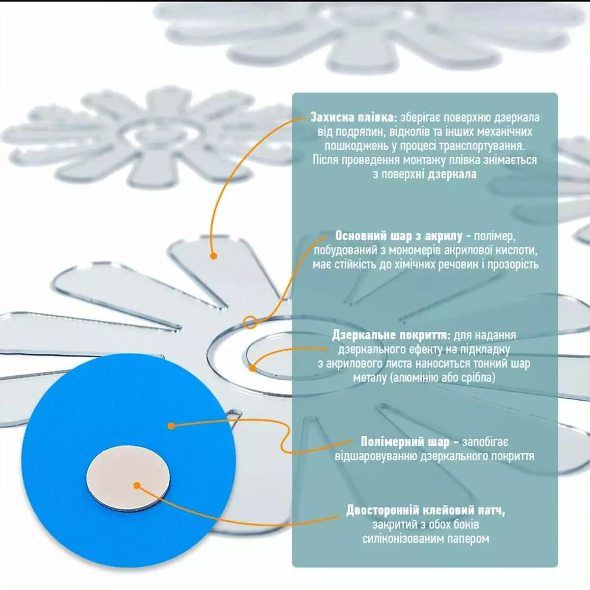 - Дзеркальний шар: це тонке металізоване або полімерне покриття, яке наноситься на акрилову основу та створює ефект дзеркального відбиття. Воно має гладку, світловідбивну поверхню, стійку до вологи та зношування. Завдяки гнучкості матеріалу відображення може незначно викривлюватися.