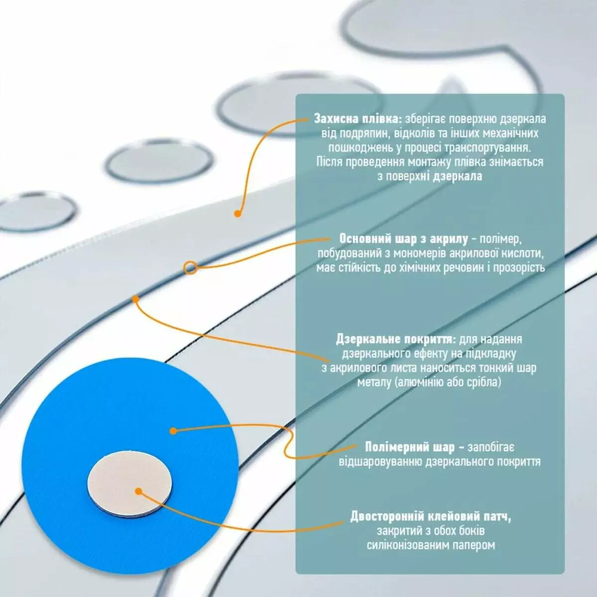 - Дзеркальний шар: це тонке металізоване або полімерне покриття, яке наноситься на акрилову основу та створює ефект дзеркального відбиття. Воно має гладку, світловідбивну поверхню, стійку до вологи та зношування. Завдяки гнучкості матеріалу відображення може незначно викривлюватися.