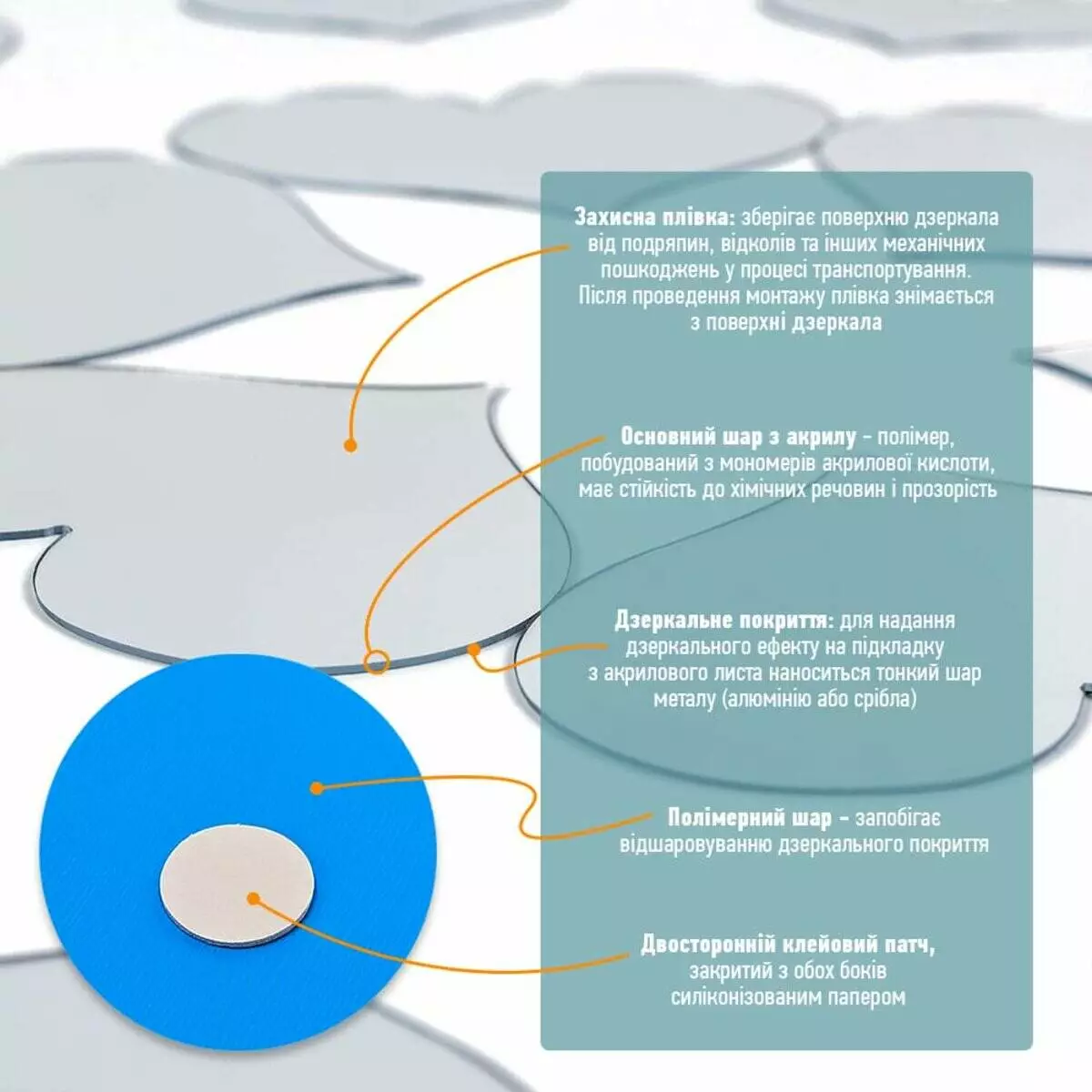 - Дзеркальний шар: це тонке металізоване або полімерне покриття, яке наноситься на акрилову основу та створює ефект дзеркального відбиття. Воно має гладку, світловідбивну поверхню, стійку до вологи та зношування. Завдяки гнучкості матеріалу відображення може незначно викривлюватися.