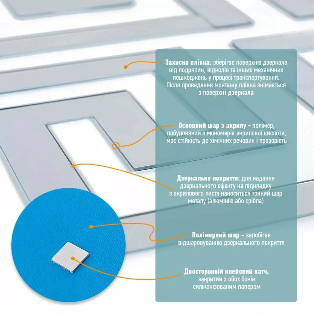 - Дзеркальний шар: це тонке металізоване або полімерне покриття, яке наноситься на акрилову основу та створює ефект дзеркального відбиття. Воно має гладку, світловідбивну поверхню, стійку до вологи та зношування. Завдяки гнучкості матеріалу відображення може незначно викривлюватися.