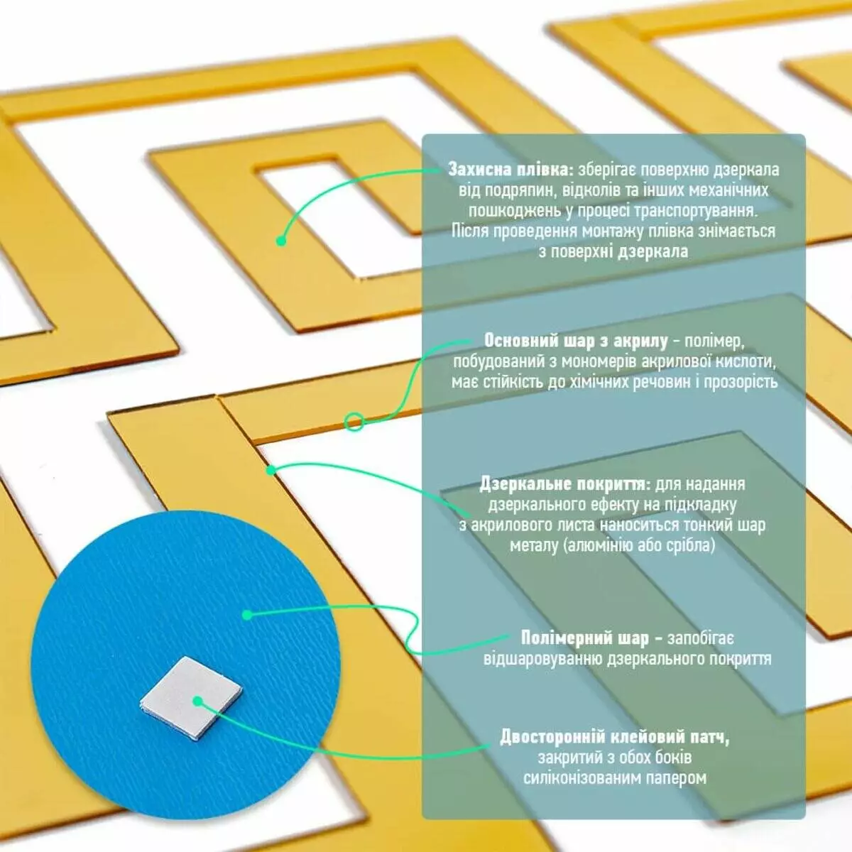 - Дзеркальний шар: це тонке металізоване або полімерне покриття, яке наноситься на акрилову основу та створює ефект дзеркального відбиття. Воно має гладку, світловідбивну поверхню, стійку до вологи та зношування. Завдяки гнучкості матеріалу відображення може незначно викривлюватися.