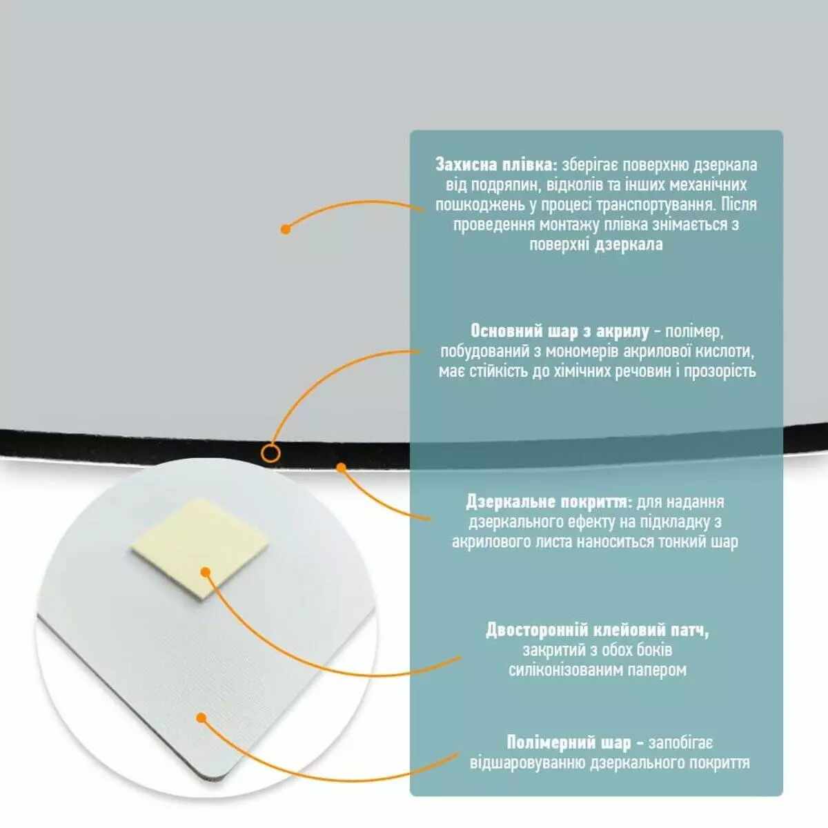 Дзеркало акрилове на клейовій основіАкрилове дзеркало є легким та ударостійким декоративним метеріалом. Виготовляється з високоякісного акрилу, який забезпечує стійкість до пошкоджень. Широко застосовуються в дизайні інтер'єру, виставкових стендах, торговому обладнанні та інших областях, де важливі легкість та безпека матеріалу.