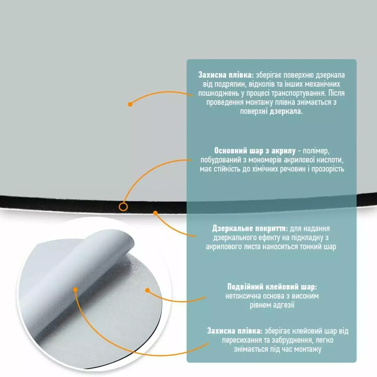- Захисна плівка: зберігає поверхню дзеркала від подряпин, відколів та інших механічних пошкоджень у процесі транспортування. Після проведення монтажу плівка знімається з поверхні дзеркала.