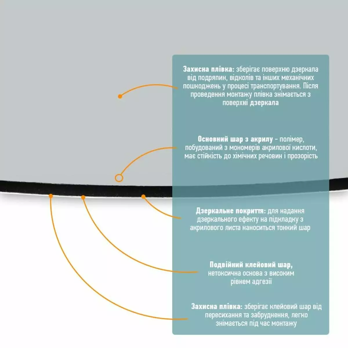 Дзеркало акрилове на клейовій основіАкрилове дзеркало є легким та ударостійким декоративним метеріалом. Виготовляється з високоякісного акрилу, який забезпечує стійкість до пошкоджень. Широко застосовуються в дизайні інтер'єру, виставкових стендах, торговому обладнанні та інших областях, де важливі легкість та безпека матеріалу.