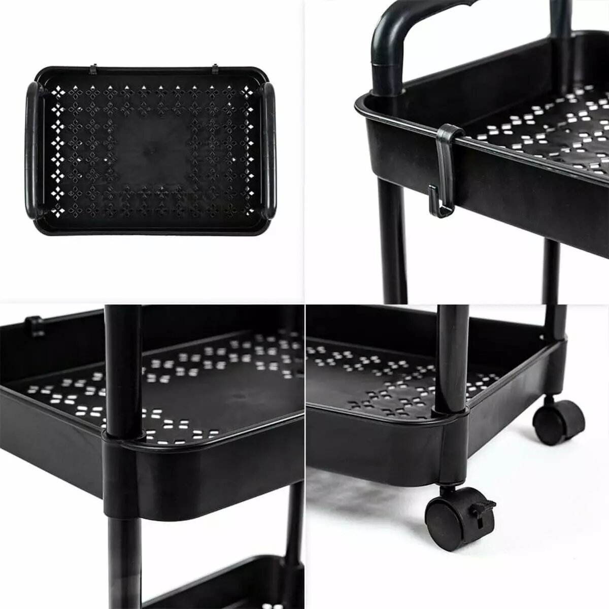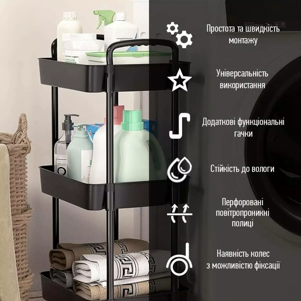 - Етажерка оснащена чотирма пластиковими колесами, які дозволяють легко переміщувати її. Також два колеса мають функцію блокування, яка дозволяє надійно зафіксувати візок у вибраному положенні.