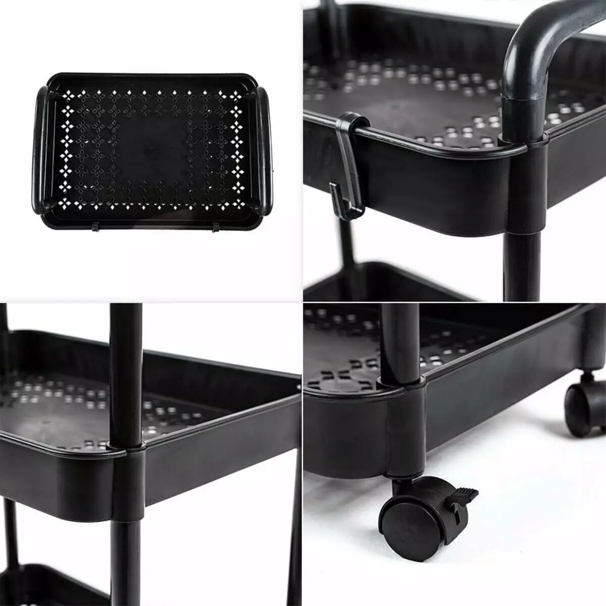 - Етажерка оснащена чотирма пластиковими колесами, які дозволяють легко переміщувати її. Також два колеса мають функцію блокування, яка дозволяє надійно зафіксувати візок у вибраному положенні.