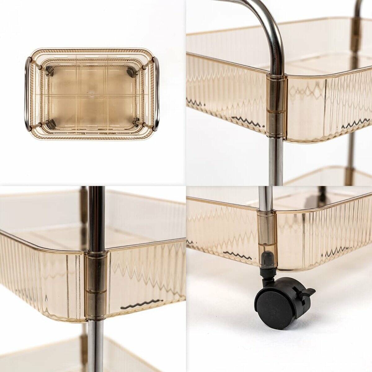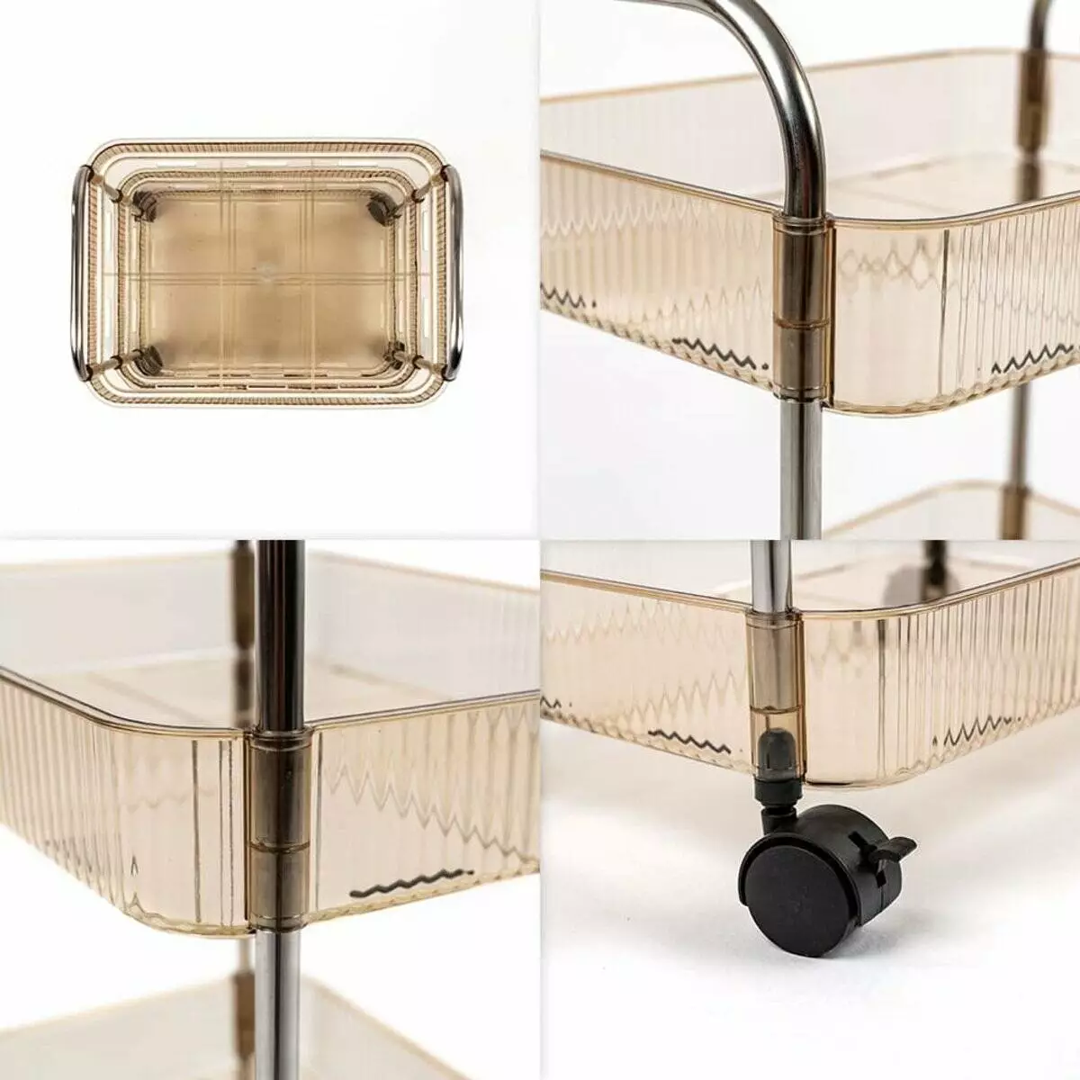 Додайте елегантність та функціональність у ваш простір з нашим багатоярусним етажеркою на колесах. Витончене поєднання прозорого пластику та металевих деталей робить цей стелаж ідеальним рішенням для тих, хто цінує стиль та зручність будинку, а також для організації та зберігання в салонах краси, масажних кабінетах та інших професійних установах. Цей стильний та практичний аксесуар поєднує елегантний дизайн та неперевершену функціональність, роблячи його незамінним помічником для фахівців. Перетворіть ваш робочий простір на оазис порядку та стилю з нашим чотириярусним візком на колесах. Замовте зараз і забезпечте собі та своїм клієнтам максимальний комфорт та зручність!