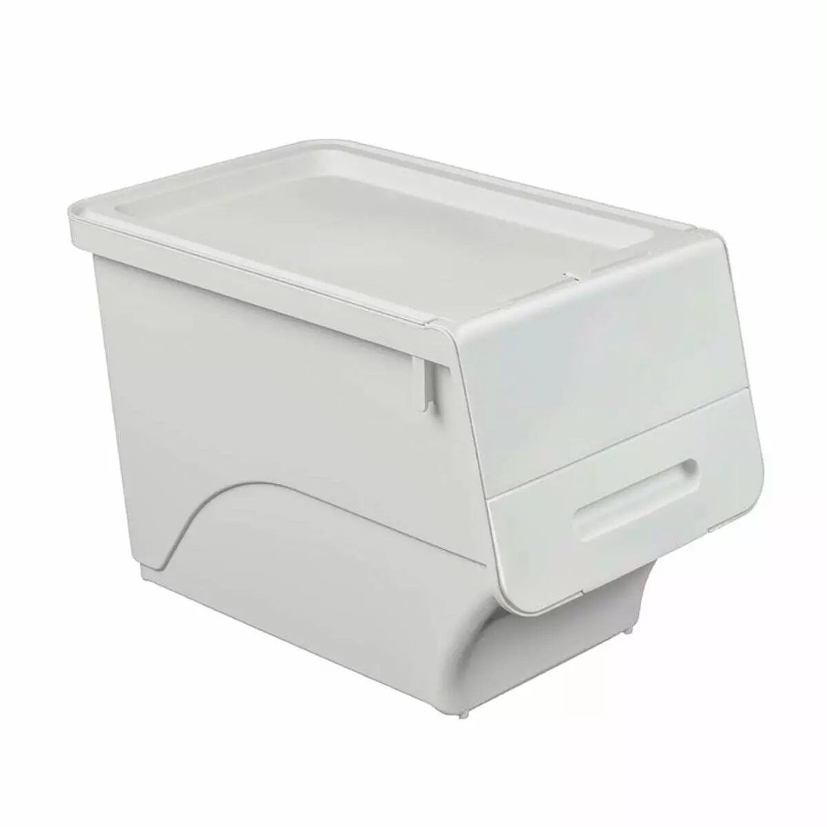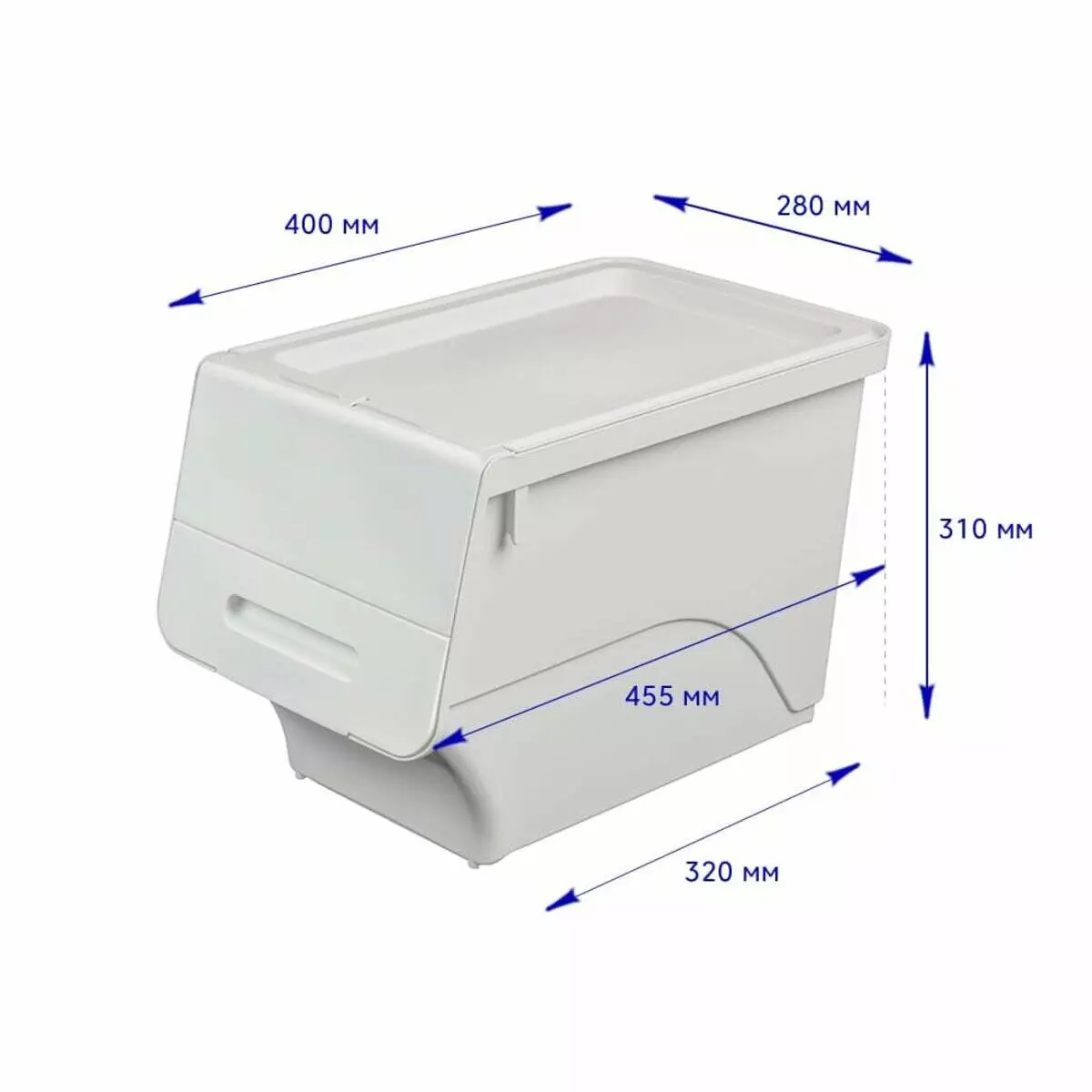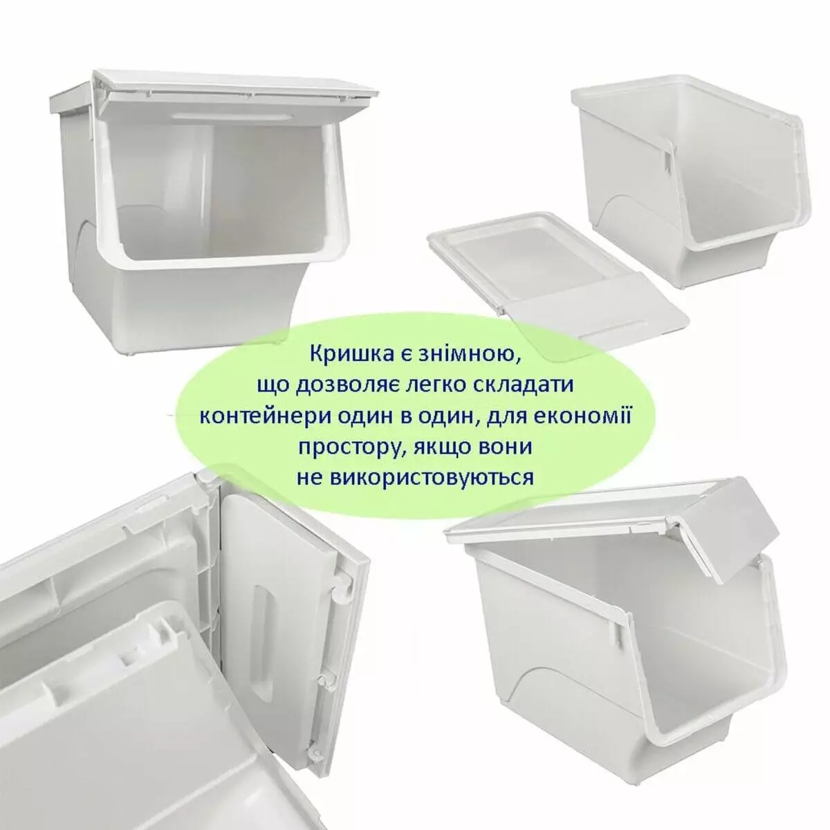 - Зручність у використанні: Розташування кришки спереду значно полегшує доступ до вмісту контейнера, особливо коли він знаходиться на висоті, а механізм фіксації в трьох положеннях дозволяє вибрати оптимальне розташування кришки, що забезпечує легкий доступ до вмісту без зайвих зусиль.