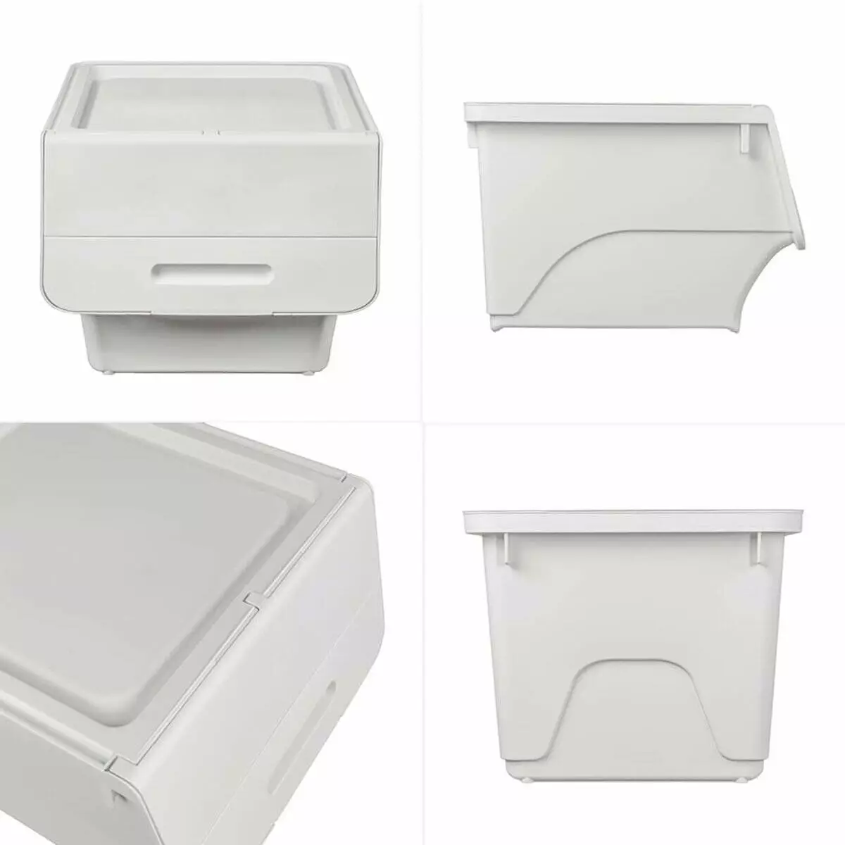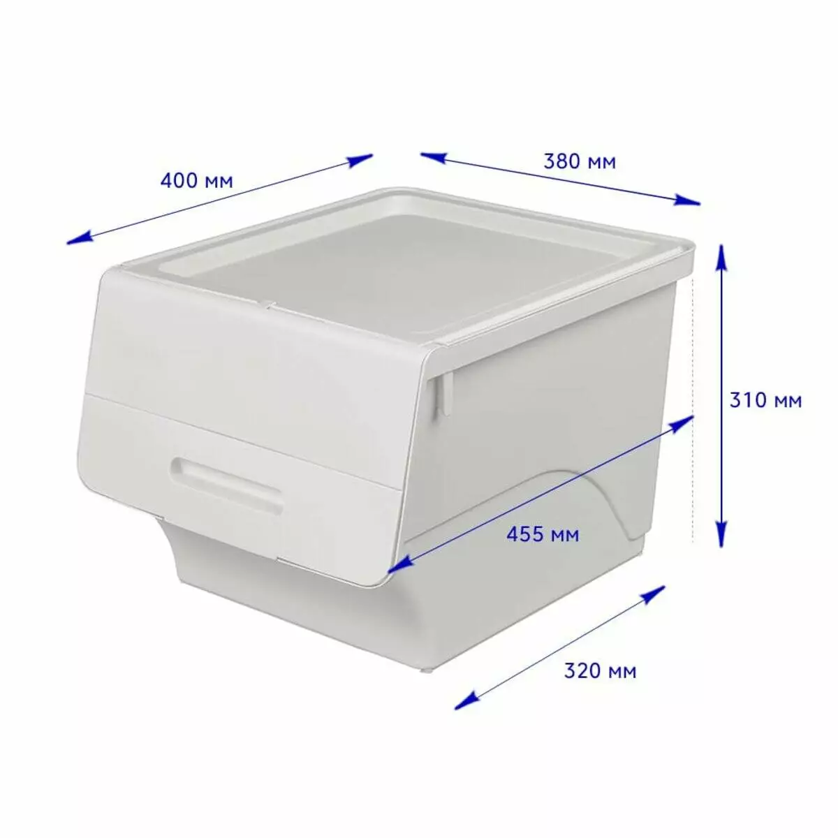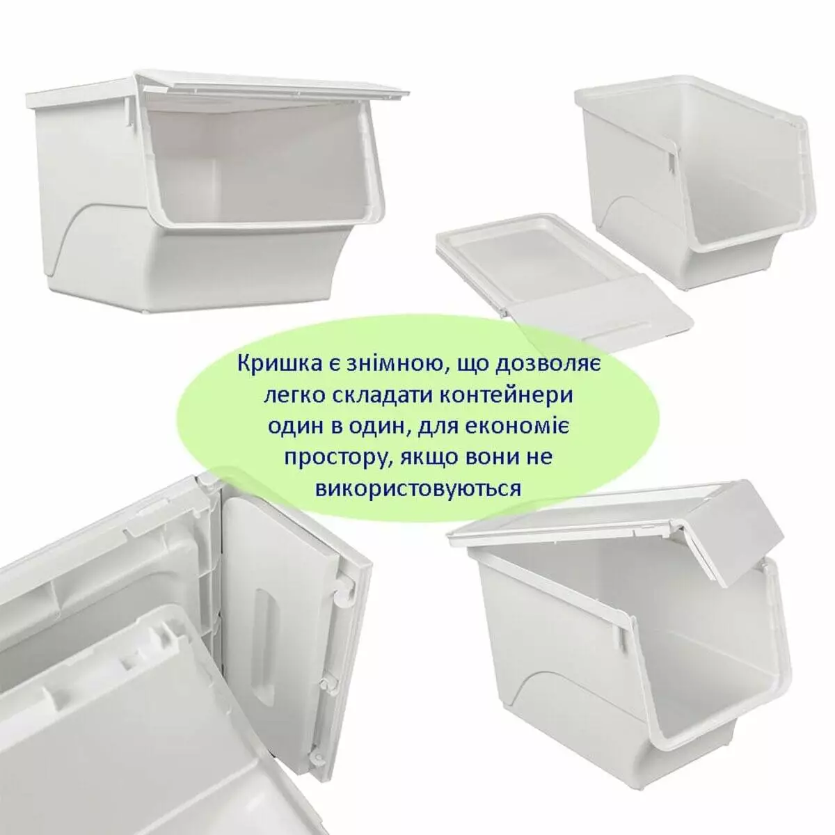 - Зручність у використанні: Розташування кришки спереду значно полегшує доступ до вмісту контейнера, особливо коли він знаходиться на висоті, а механізм фіксації в трьох положеннях дозволяє вибрати оптимальне розташування кришки, що забезпечує легкий доступ до вмісту без зайвих зусиль.