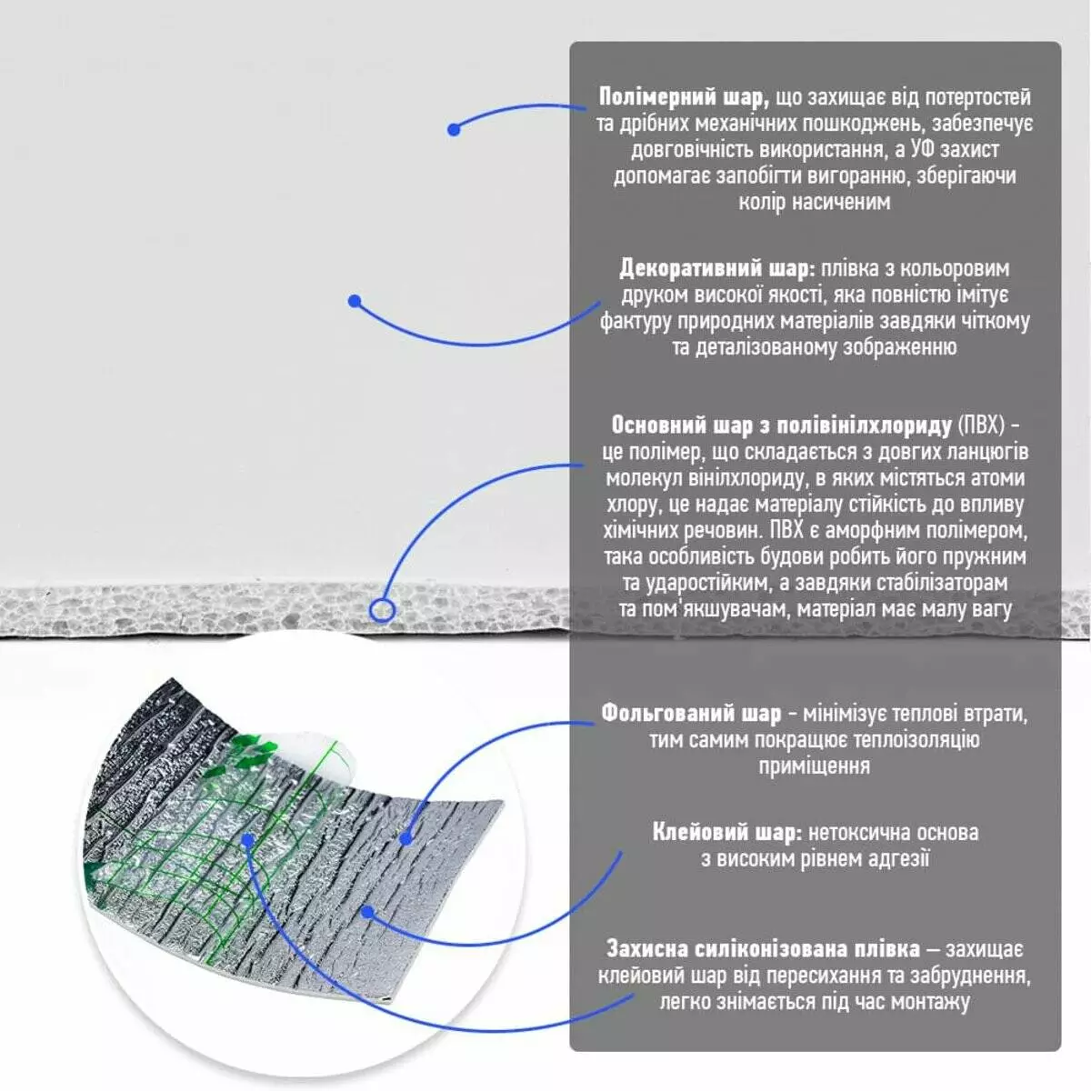 - Основний шар з полівінілхлориду (ПВХ) - це полімер, що складається з довгих ланцюгів молекул вінілхлориду, в яких містяться атоми хлору, це надає матеріалу стійкість до впливу хімічних речовин. ПВХ є аморфним полімером, така особливість будови робить його пружним та ударостійким, а завдяки стабілізаторам та пом'якшувачам, матеріал має малу вагу.