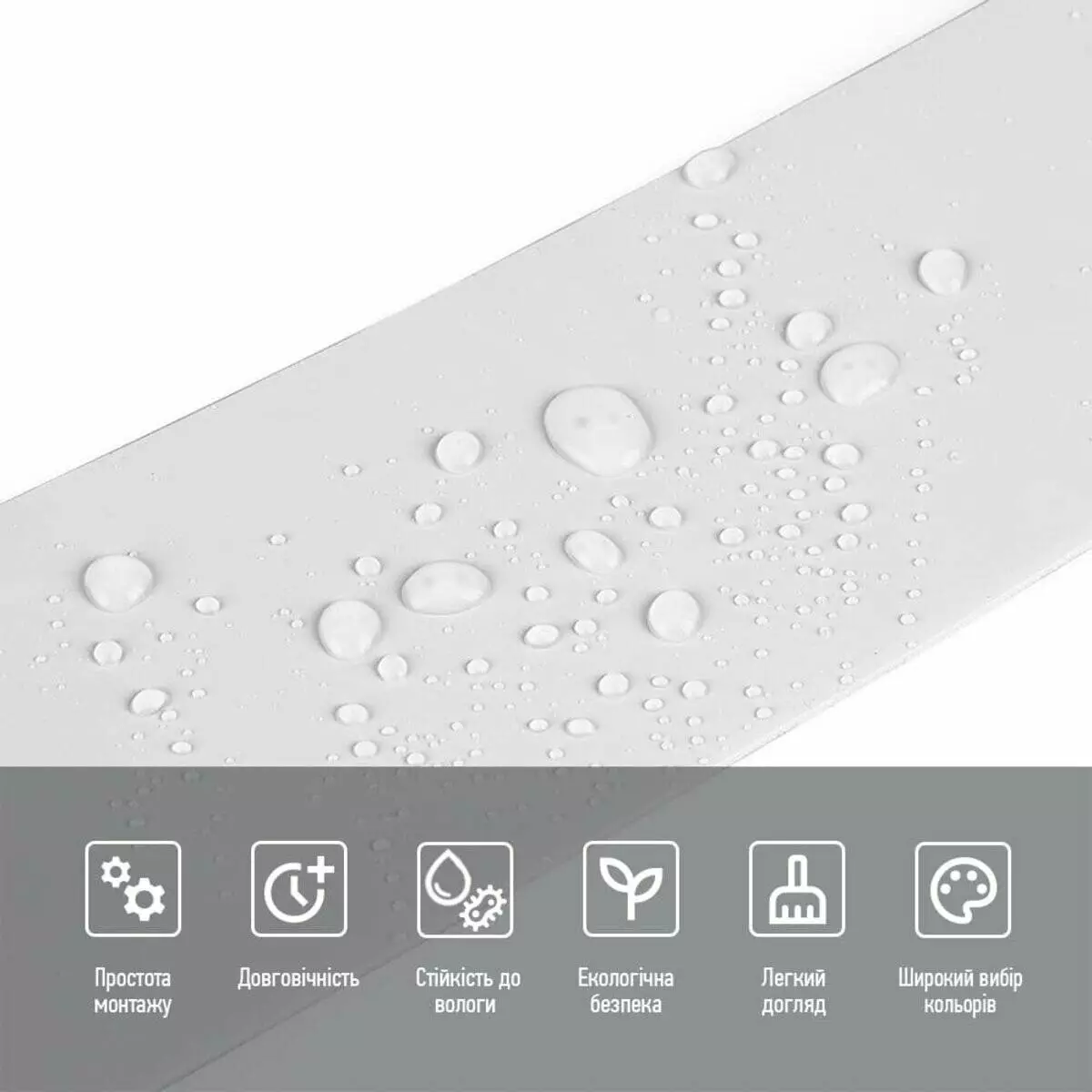 - Стійкість до вологи: вінілові молдінги стійкі до вологи, що робить їх відмінним вибором для ванних кімнат, кухонь та інших приміщень з підвищеною вологістю, матеріал стійкий також до впливу пари, а також до появи плісняви. Молдинг підходить для створення фартуха кухні, можна клеїти біля плити на відстані не менше ніж 30-50 см;