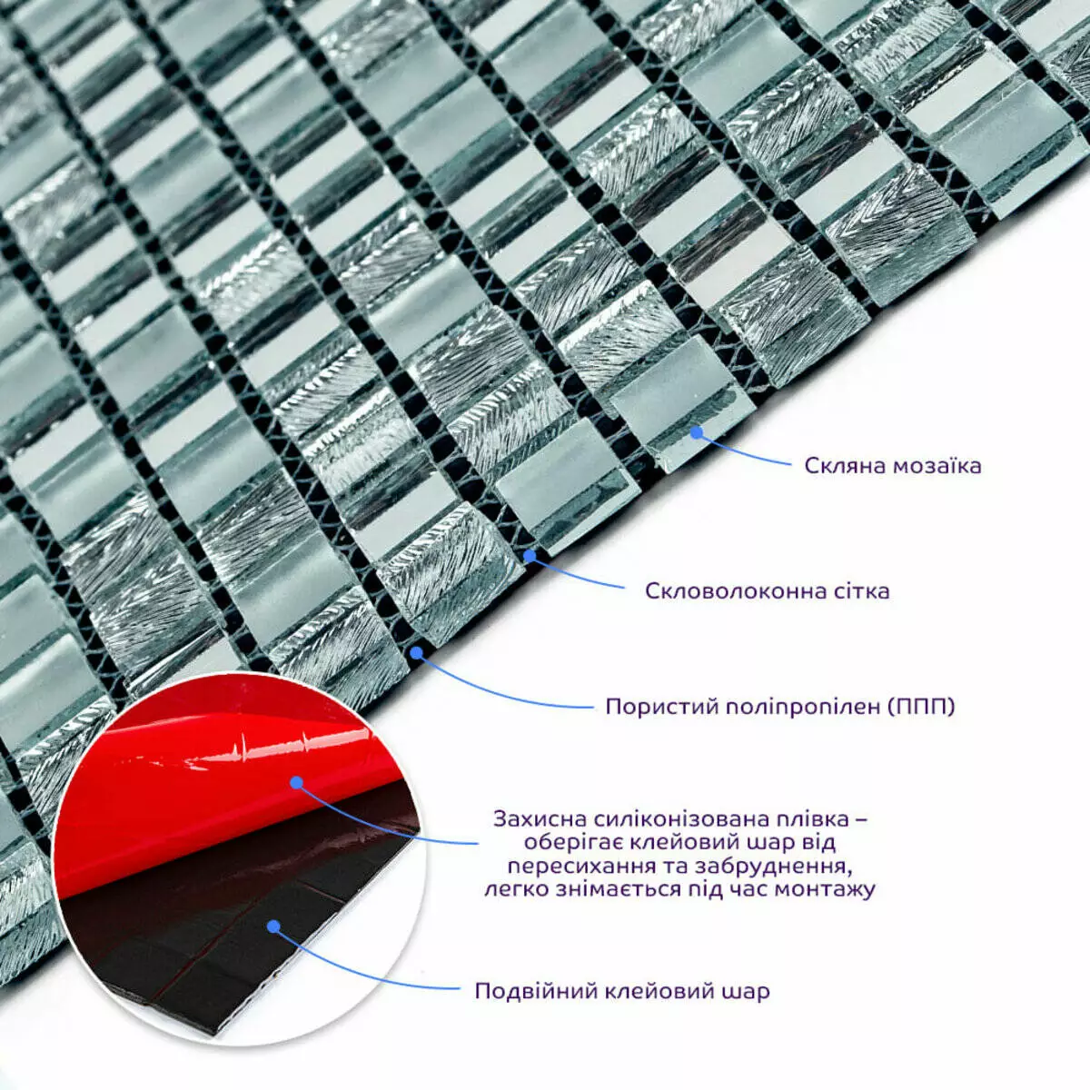 Опис: Скляна мозаїка — це елегантний декоративний матеріал, який відмінно підходить для створення яскравих акцентів в інтер’єрі. Завдяки клейовій основі, мозаїка швидко монтується та ідеально підходить для обробки різноманітних поверхонь, зокрема стін у ванних кімнатах та кухнях.