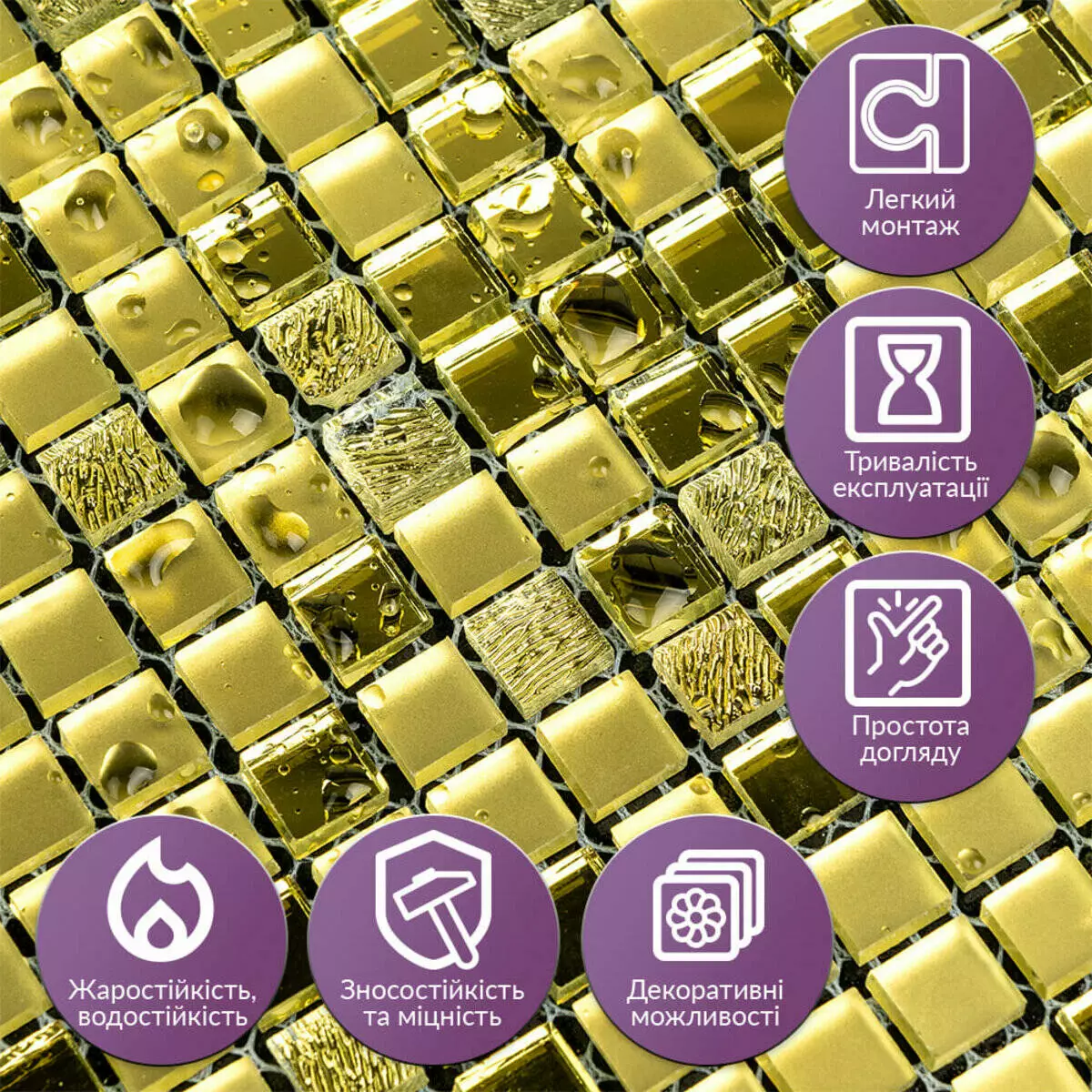 • Міцність та зносостійкість: Завдяки високоякісному склу та інноваційній технології обробки кожна частинка мозаїки має високу стійкість до подряпин і механічних пошкоджень. Це забезпечує довгий термін служби, навіть за умови інтенсивного використання.