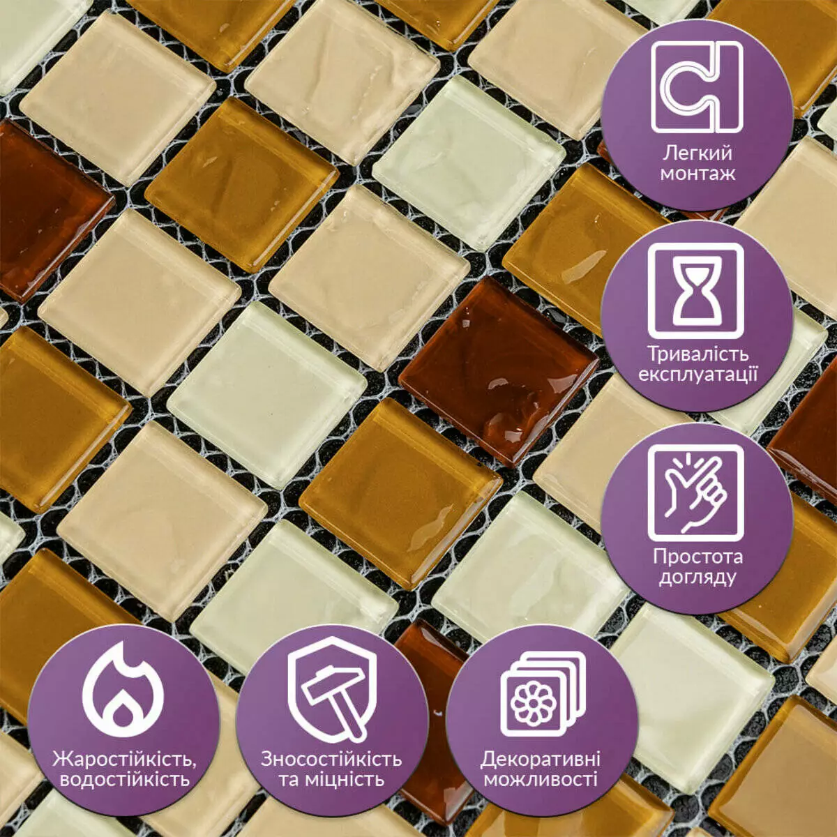 • Міцність та зносостійкість: Завдяки високоякісному склу та інноваційній технології обробки кожна частинка мозаїки має високу стійкість до подряпин і механічних пошкоджень. Це забезпечує довгий термін служби, навіть за умови інтенсивного використання.