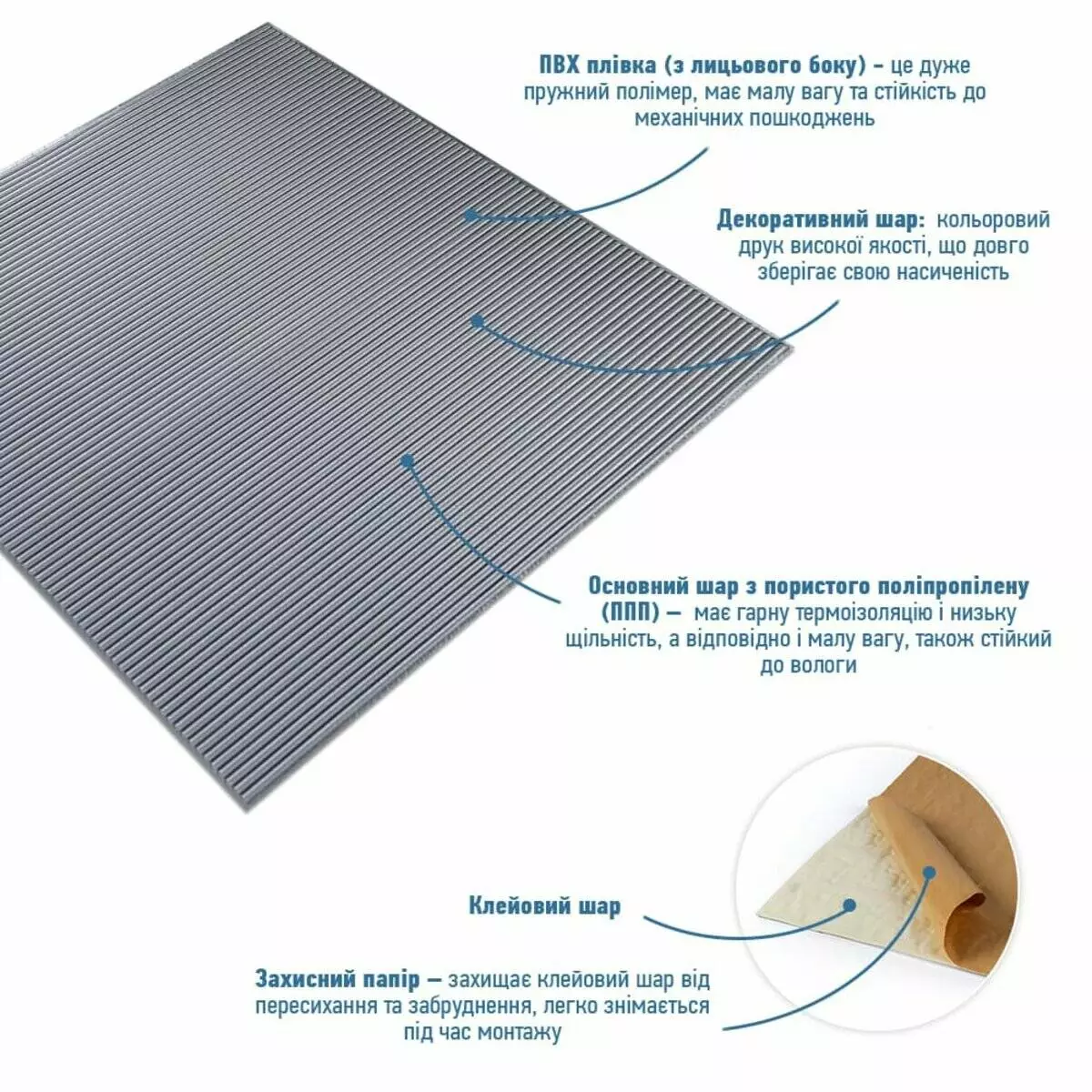 - Захисний папір – оберігає клейовий шар від пересихання та забруднення, легко знімається під час монтажу.