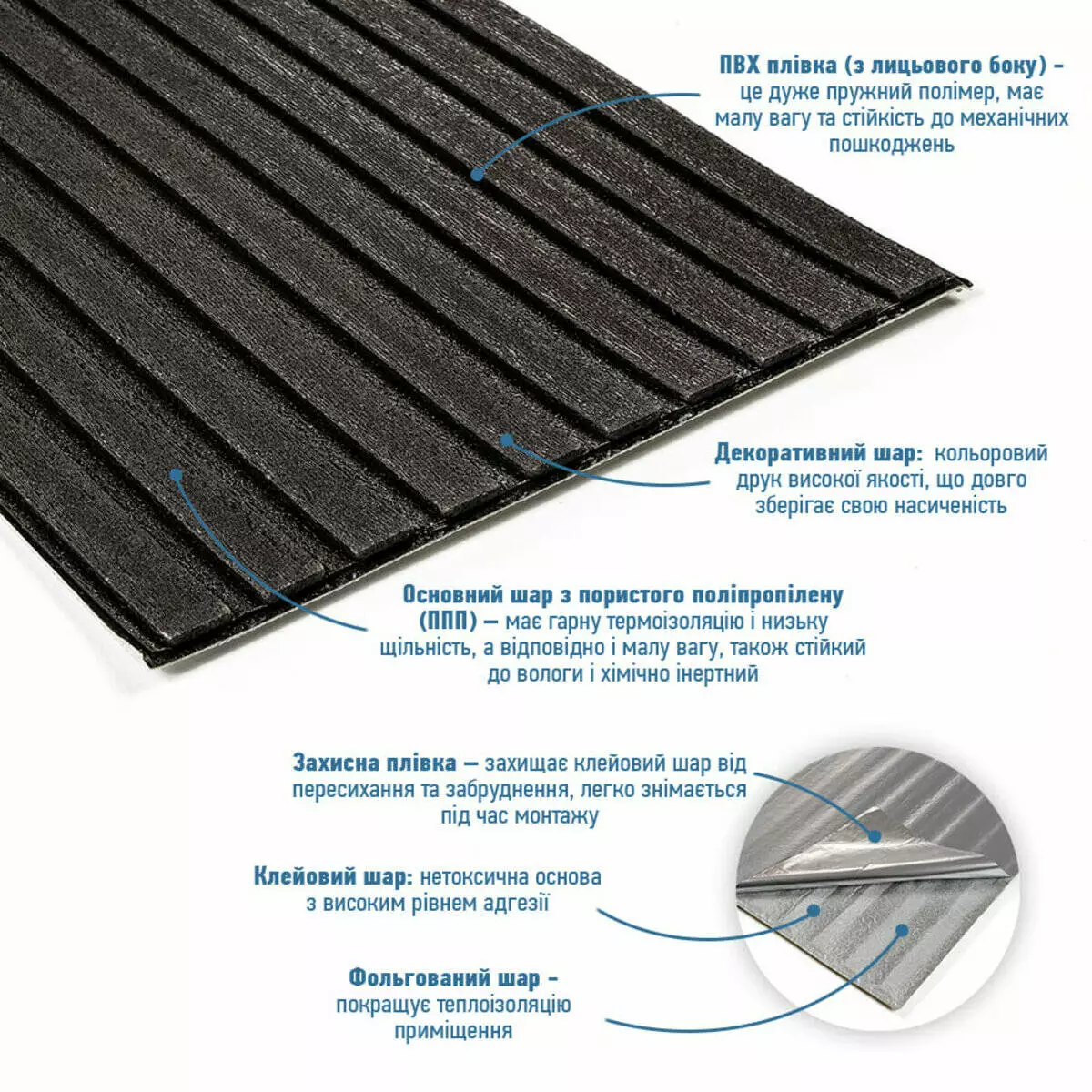 - Легкість монтажу: наявність клейового шару дозволяє встановити панелі без необхідності застосування додаткових матеріалів.