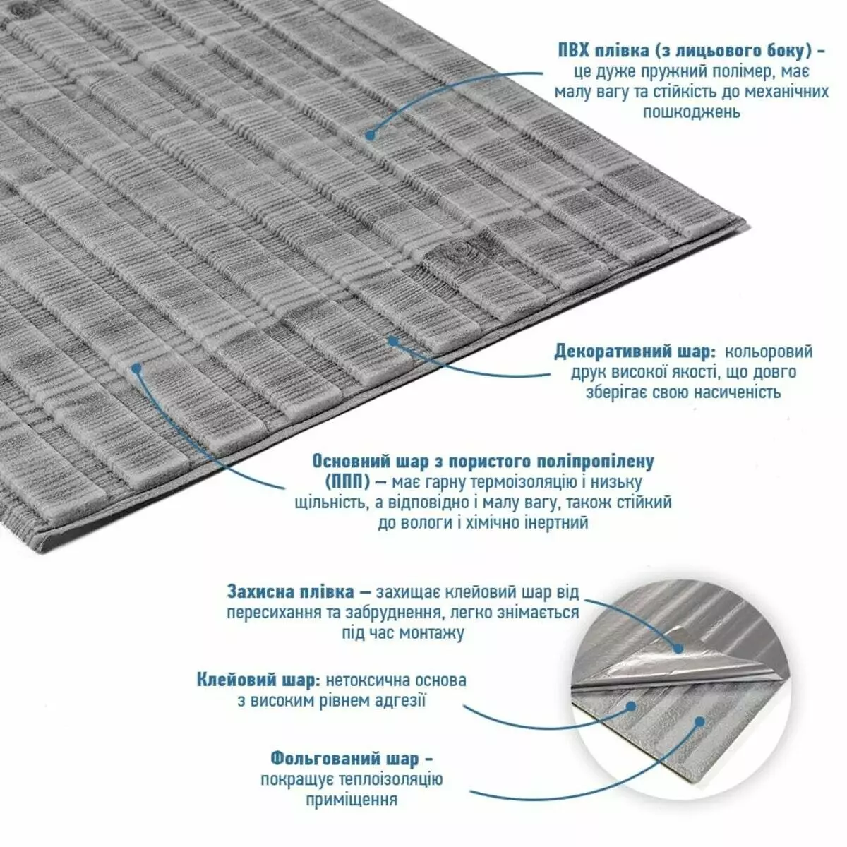 - Легкість монтажу: наявність клейового шару дозволяє встановити панелі без необхідності застосування додаткових матеріалів.