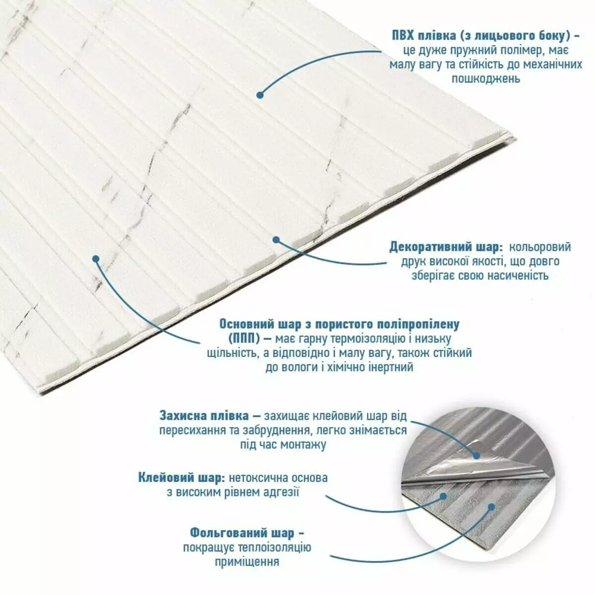 - Захисний папір – оберігає клейовий шар від пересихання та забруднення, легко знімається під час монтажу.