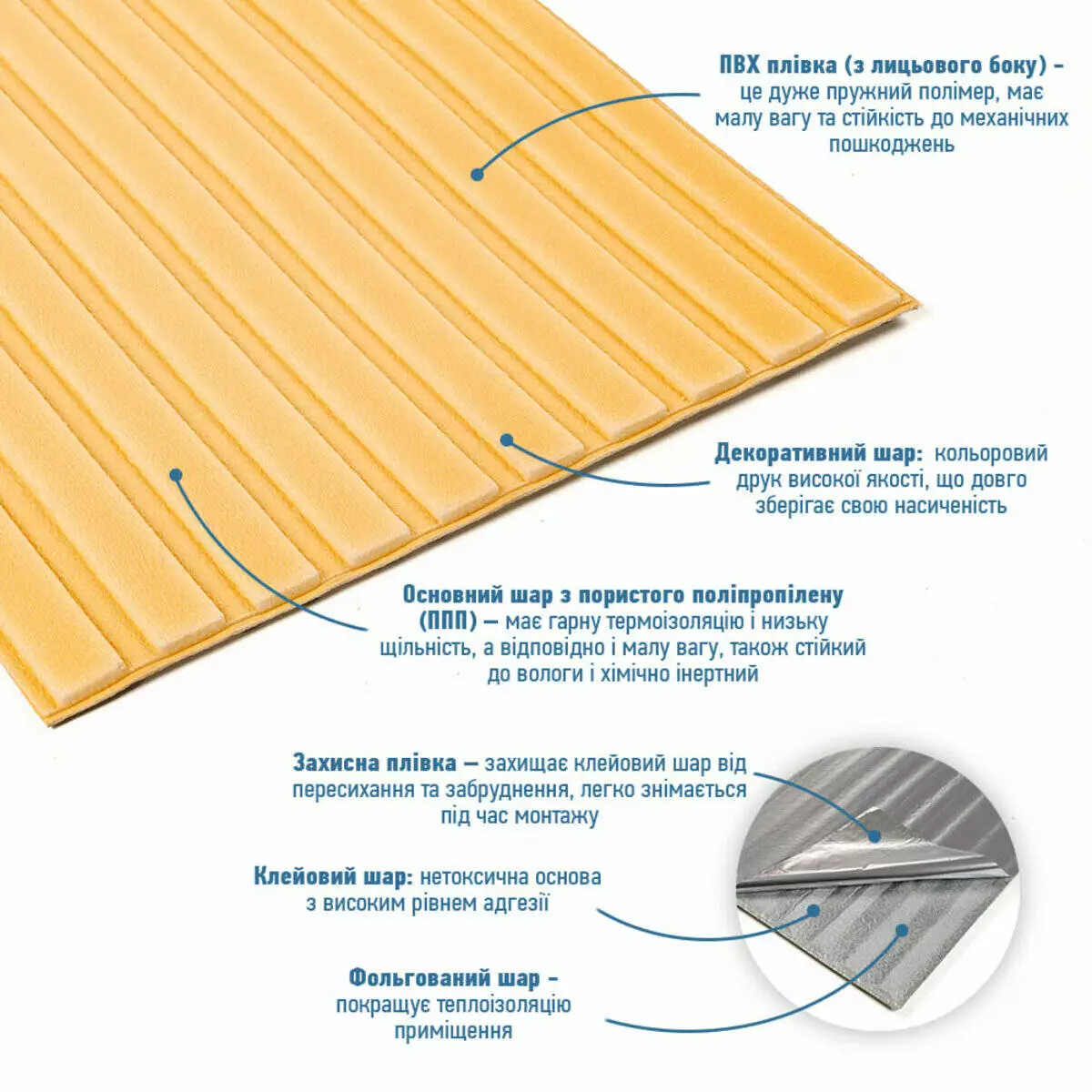 - Легкість монтажу: наявність клейового шару дозволяє встановити панелі без необхідності застосування додаткових матеріалів.