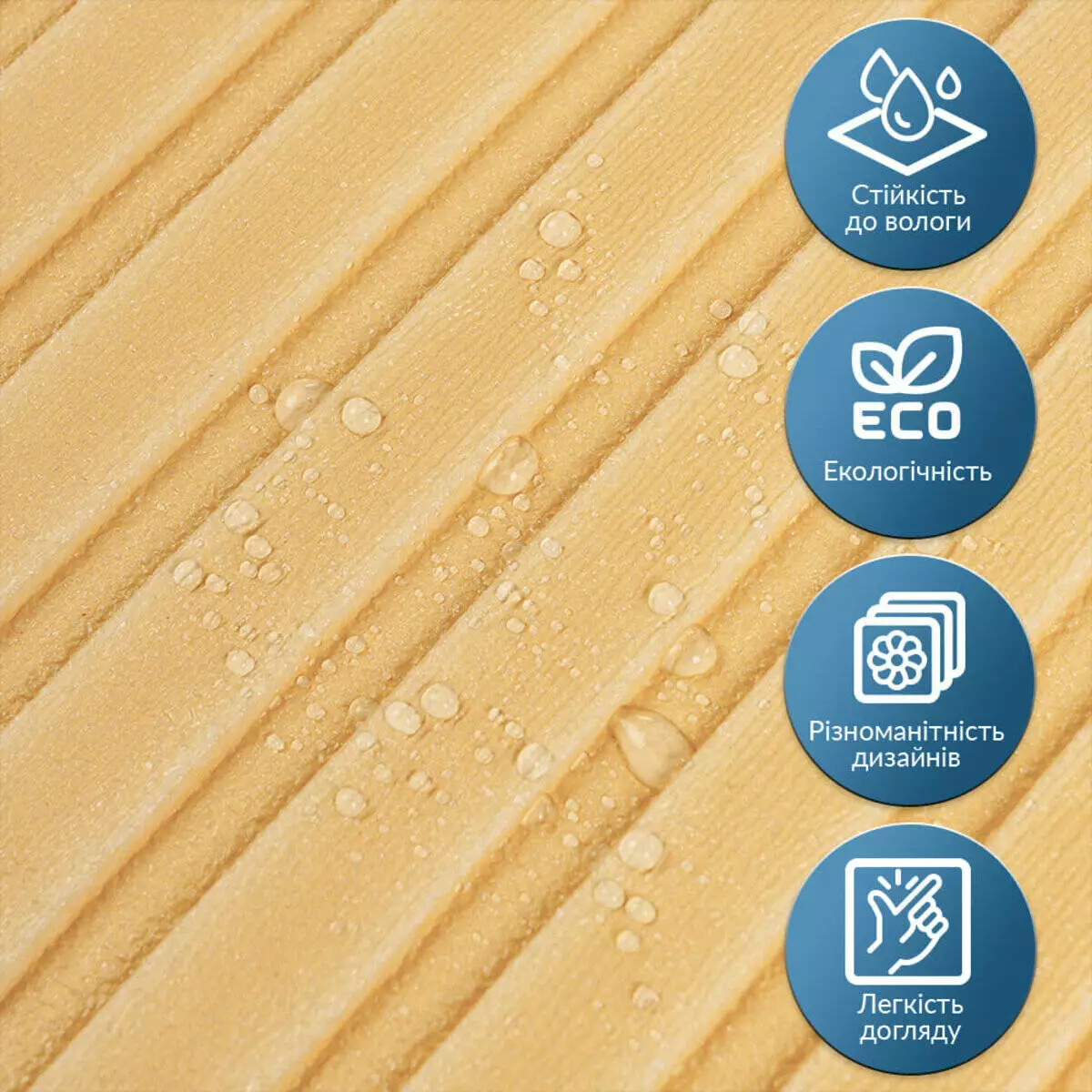 - Стійкість до води та хімічних речовин: пористий поліпропілен має гарну стійкість до вологи, це дає можливість застосовувати його у приміщеннях з підвищеною вологістю, а завдяки захисній ПВХ плівці, панель можна мити побутовими миючими засобами (без використання щітки з високою абразивною здатністю).